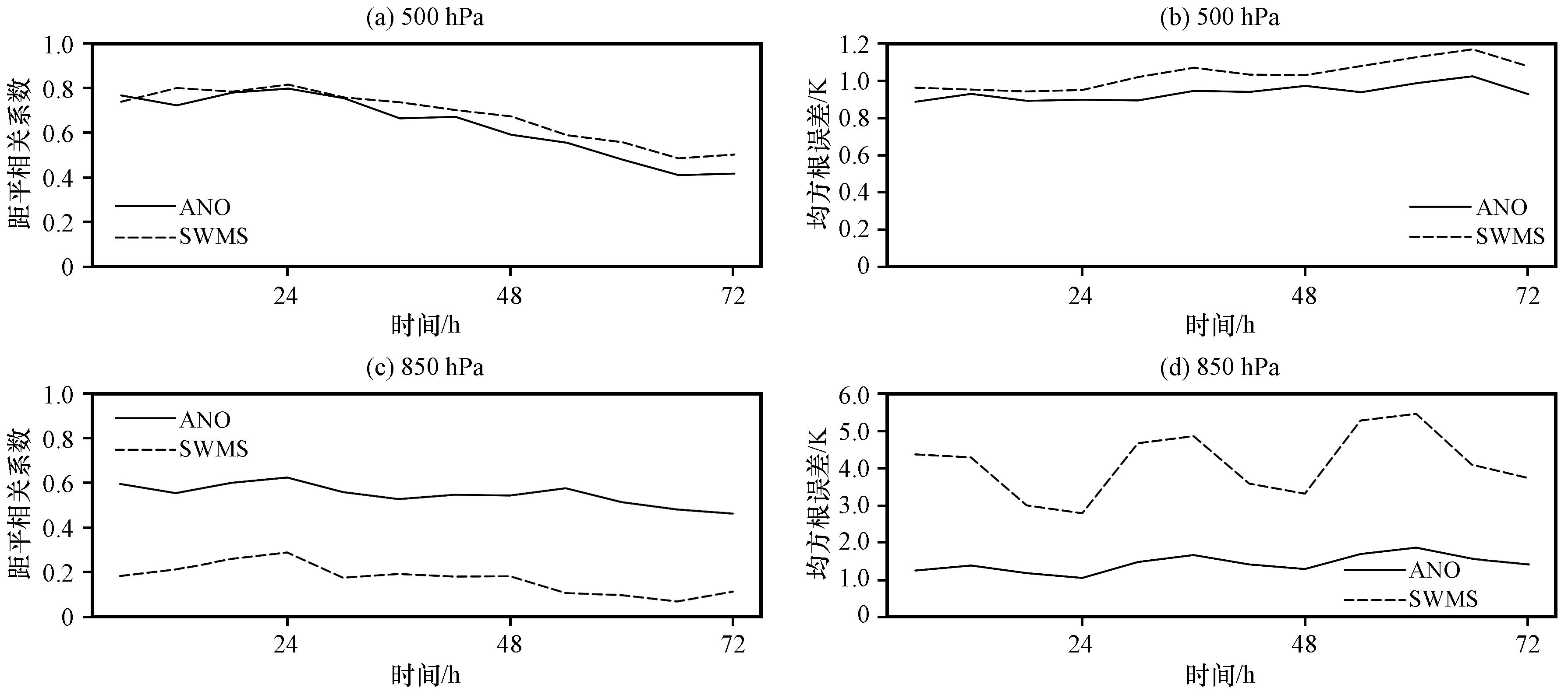 图5 2019年6月20 -22日SWMS模式预报和ANO订正的500 hPa(上)、 850 hPa(下)温度平均距平相关系数(左)和均方根误差(右, 单位: K)的时间演变Fig.5 Temporal evolution of the mean ACC (left) and RMSE (right, unit: K) for the 500 hPa (top) and 850 hPa (bottom) temperature from the SWMS model forecast and ANO correction, initiated on June 20 -22, 2019 |