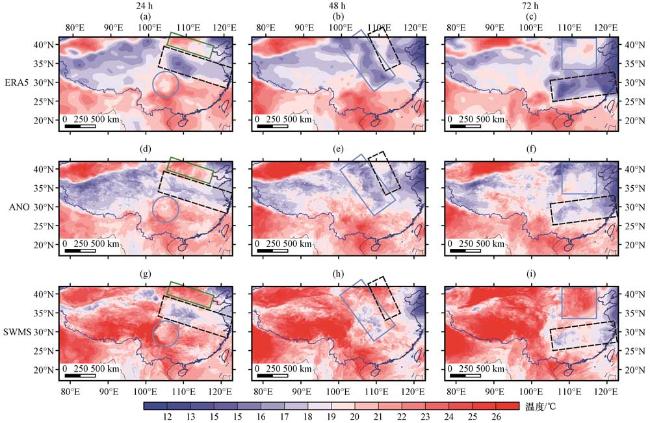 图6 2019年6月20日24 h(左)、 48 h(中)和72 h(右)850 hPa温度场的ERA5再分析场(a、 b、 c)、 ANO订正(d、 e、 f)和SWMS模式预报(g、 h、 i)对比(单位: ℃)Fig.6 Comparison of the ERA5 reanalysis data (a, b, c), ANO correction (d, e, f), and SWMS model forecast (g, h, i) for the 850 hPa temperature (unit: ℃) at 24-hour (left), 48-hour (middle), and 72-hour (right) initiated on June 20, 2019 |