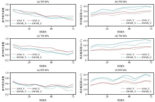 图7 2019年6月20 -22日SWMS模式预报和ANO订正的500 hPa(上)、 700 hPa(中)、 850 hPa(下) 水平风u分量(实线)及v分量(虚线)平均距平相关系数(左)和均方根误差(右, 单位: m·s-1)的时间演变Fig.7 Temporal evolution of the mean ACC (left) and RMSE (right, unit: m·s-1) for the u-component (solid line) and v-component (dashed line) of the horizontal wind at 500 hPa (top), 700 hPa (middle), and 850 hPa (bottom) from the SWMS model forecast and ANO correction, initiated on June 20 -22, 2019 |