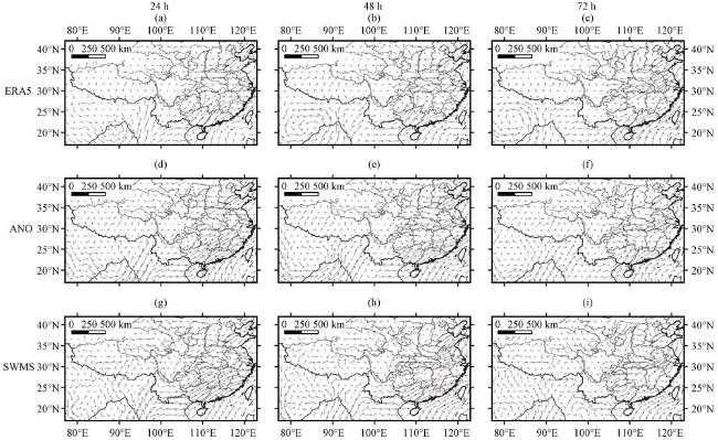 图8 2019年6月20日24 h(左)、 48 h(中)和72 h(右)850 hPa水平风场的ERA5再分析场(a、 b、 c)、 ANO订正(d、 e、 f)和SWMS模式预报(g、 h、 i)对比(单位: m·s-1)Fig.8 Comparison of the ERA5 reanalysis data (a, b, c), ANO correction (d, e, f), and SWMS model forecast (g, h, i) for the 850 hPa horizontal wind (unit: m·s-1) at 24-hour (left), 48-hour (middle), and 72-hour (right) initiated on June 20, 2019 |