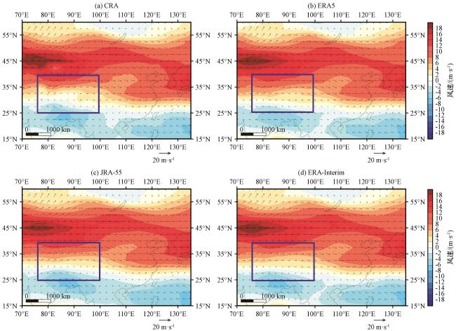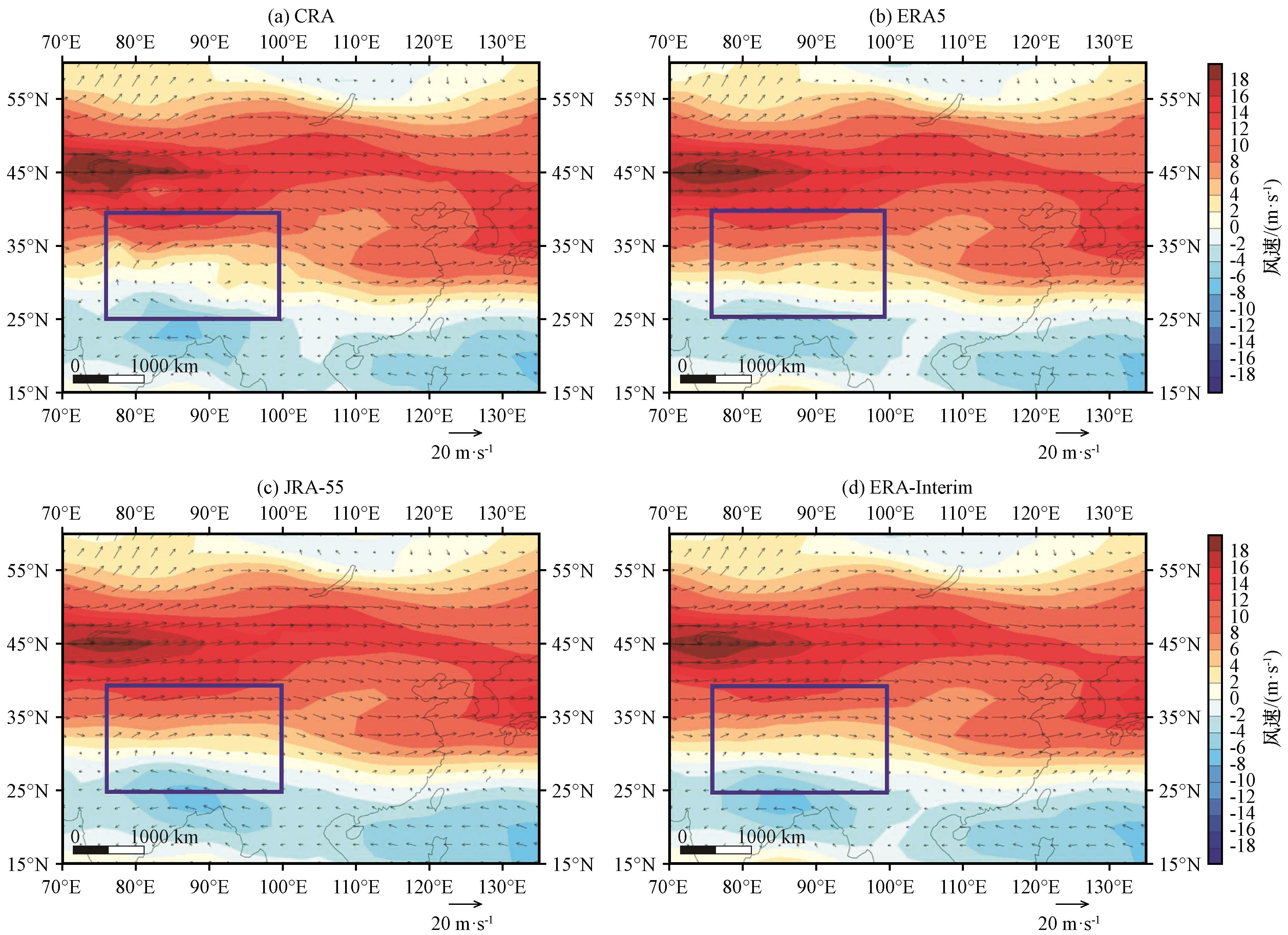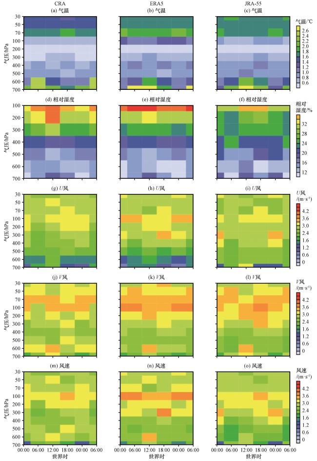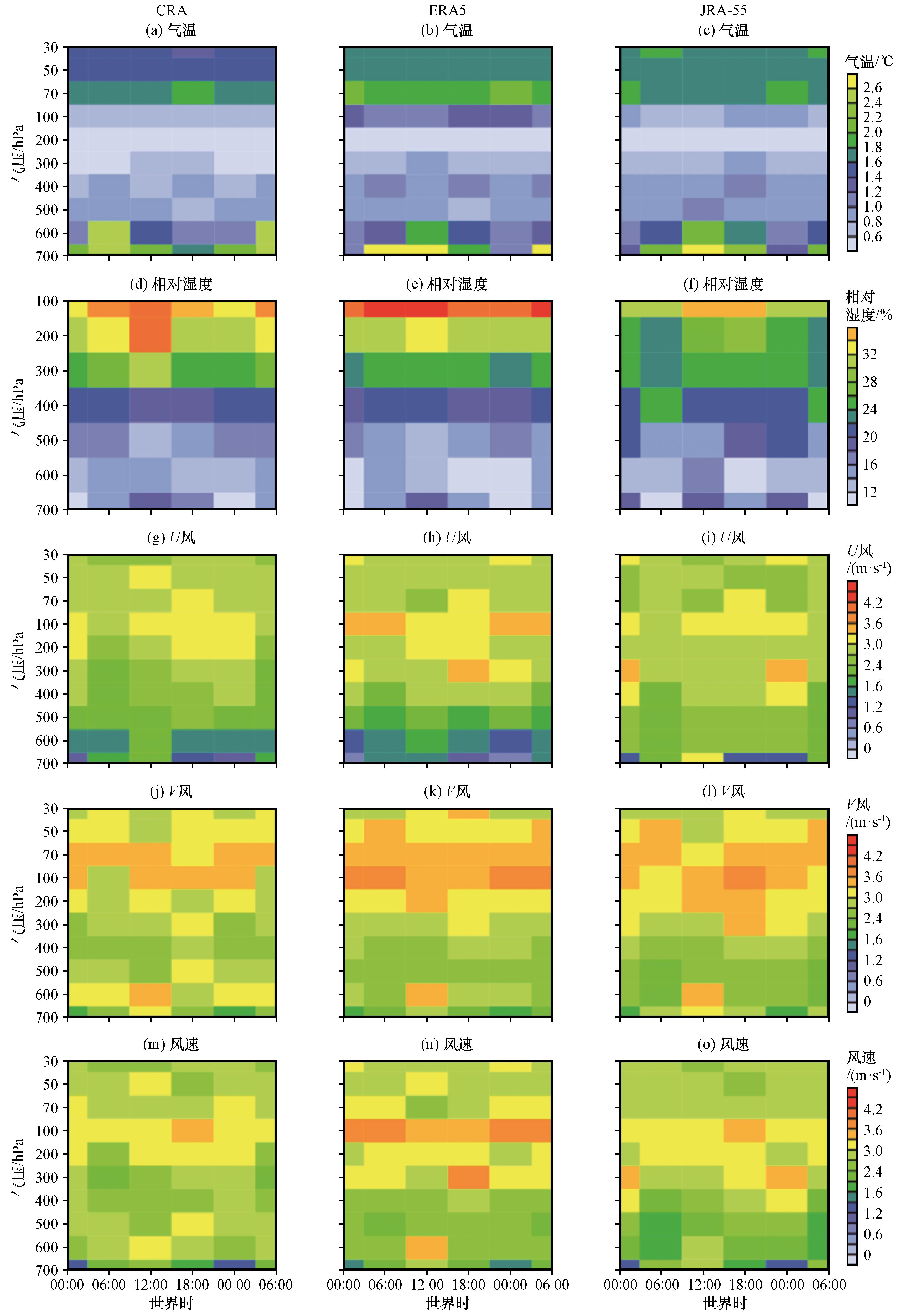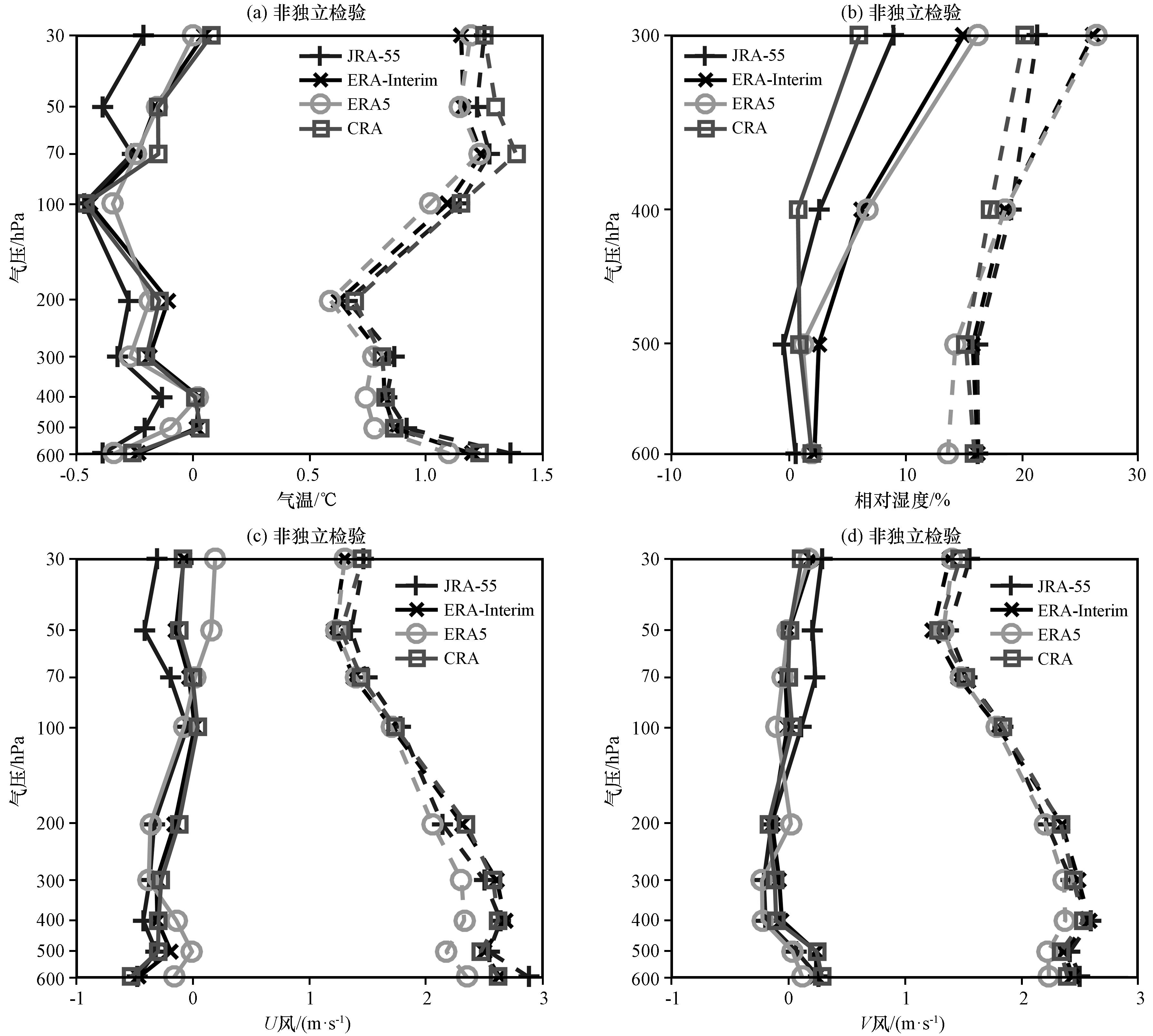 青藏高原天气气候不仅对亚洲区域气候产生深远影响,还在更大范围内调控北半球气候格局。国外多种大气再分析产品已被广泛用于揭示高原天气气候特征。中国气象局于2020年发布了第一代全球大气再分析产品(CRA),前期评估发现其在常规观测数据密集区表现优异,但在观测稀疏的青藏高原地区性能尚待研究。因此,基于第三次青藏高原大气科学试验5个台站2014年6-8月共686条未被模式同化的高质量探空廓线,对 CRA 在高原上空的温度、风场和相对湿度进行独立检验;并选取高原及周边21个探空站业务观测数据开展非独立性检验,将评估结果与欧洲中期天气预报中心(ECMWF)中期再分析产品(ERA-Interim)、ECMWF 第五代再分析产品(ERA5)及日本 55 年再分析产品(JRA-55)共三套再分析产品进行对比分析。非独立检验结果表明:在对流层和平流层低层,CRA温度和风场与业务探空观测的相关系数均大于0. 9。相对于业务探空观测,CRA温度在对流层中高层的均方根误差(RMSE)小于1 ℃,400 hPa和500 hPa温度平均偏差(Bias)接近于0 ℃。CRA近地面纬向风的RMSE约为2. 5 m·s-1,随高度逐渐减小,至100 hPa下降至1. 5 m·s-1。相对湿度在各高度层的RMSE均维持在20%以下。独立检验结果表明:从600 hPa至30 hPa,CRA相对于探空温度、纬向风和经向风的均方根误差(RMSE)均值在高原西部分别为1. 38 ℃、3. 19 m·s-1和3. 22 m·s-1;在高原东部分别为1. 16 ℃、2. 65 m·s-1和2. 90 m·s-1,西部区域各要素误差略高于东部,且表现出显著的日变化特征。600 hPa及以下,CRA的气温和相对湿度误差最大值均出现在午后。在500 hPa,CRA相对湿度误差最大值出现在傍晚。总体上,CRA能够客观地再现青藏高原地区温度、风速和相对湿度的垂直变化特征。与其他几套再分析产品相比,CRA 相对湿度最接近探空湿度观测,风场误差略高于其他再分析产品,但平均差异不超过0. 4 m·s-1。