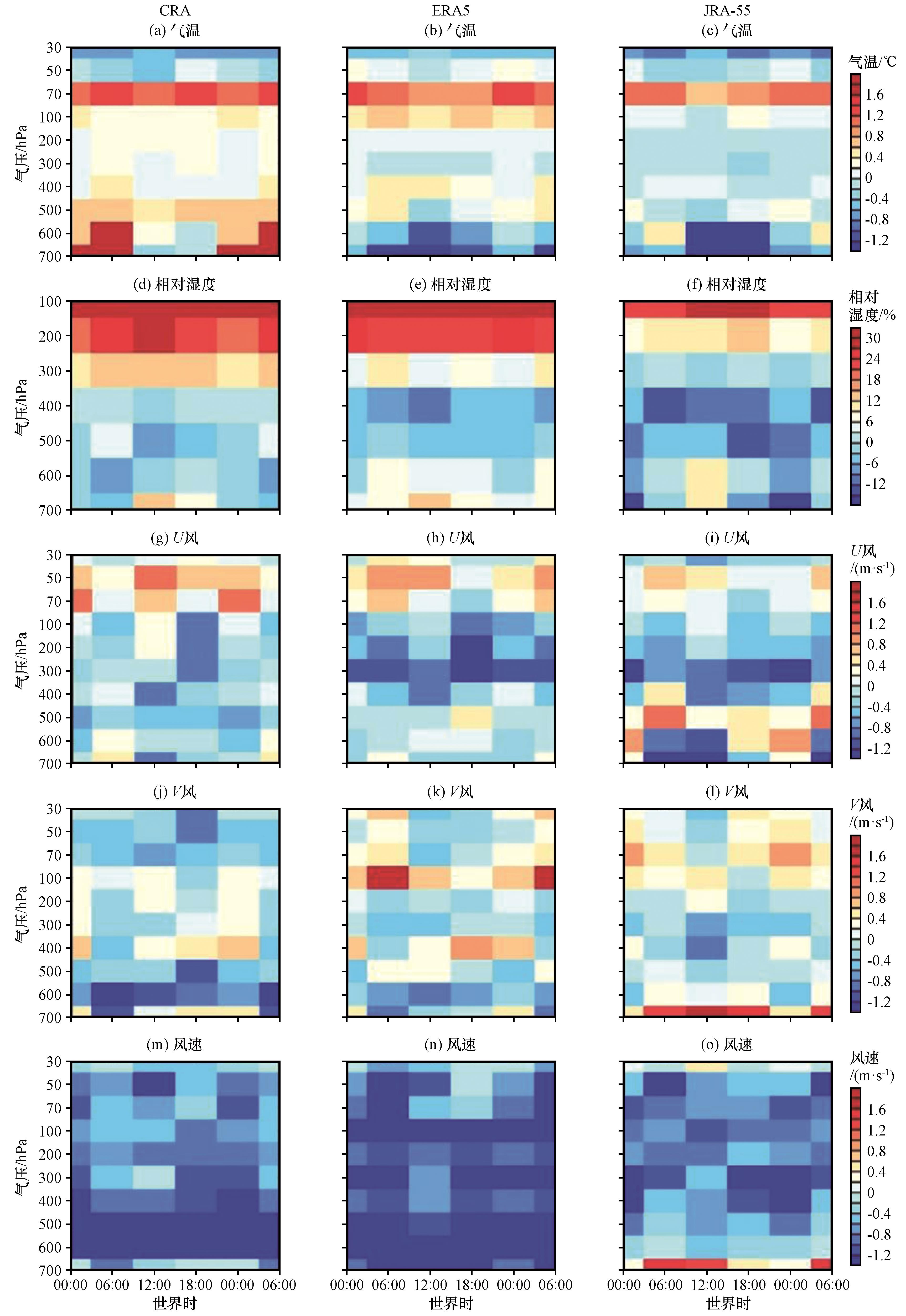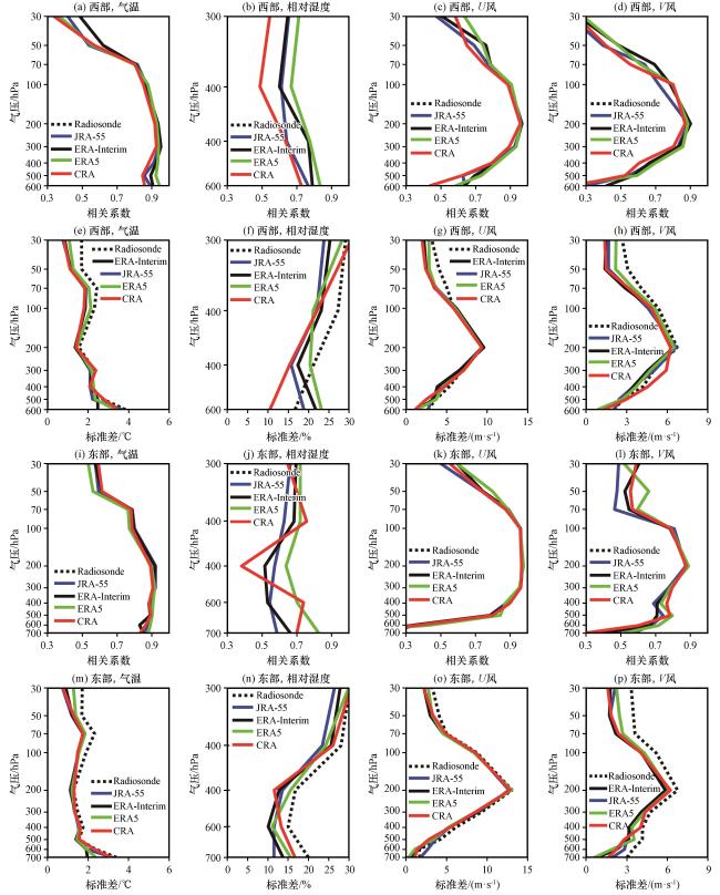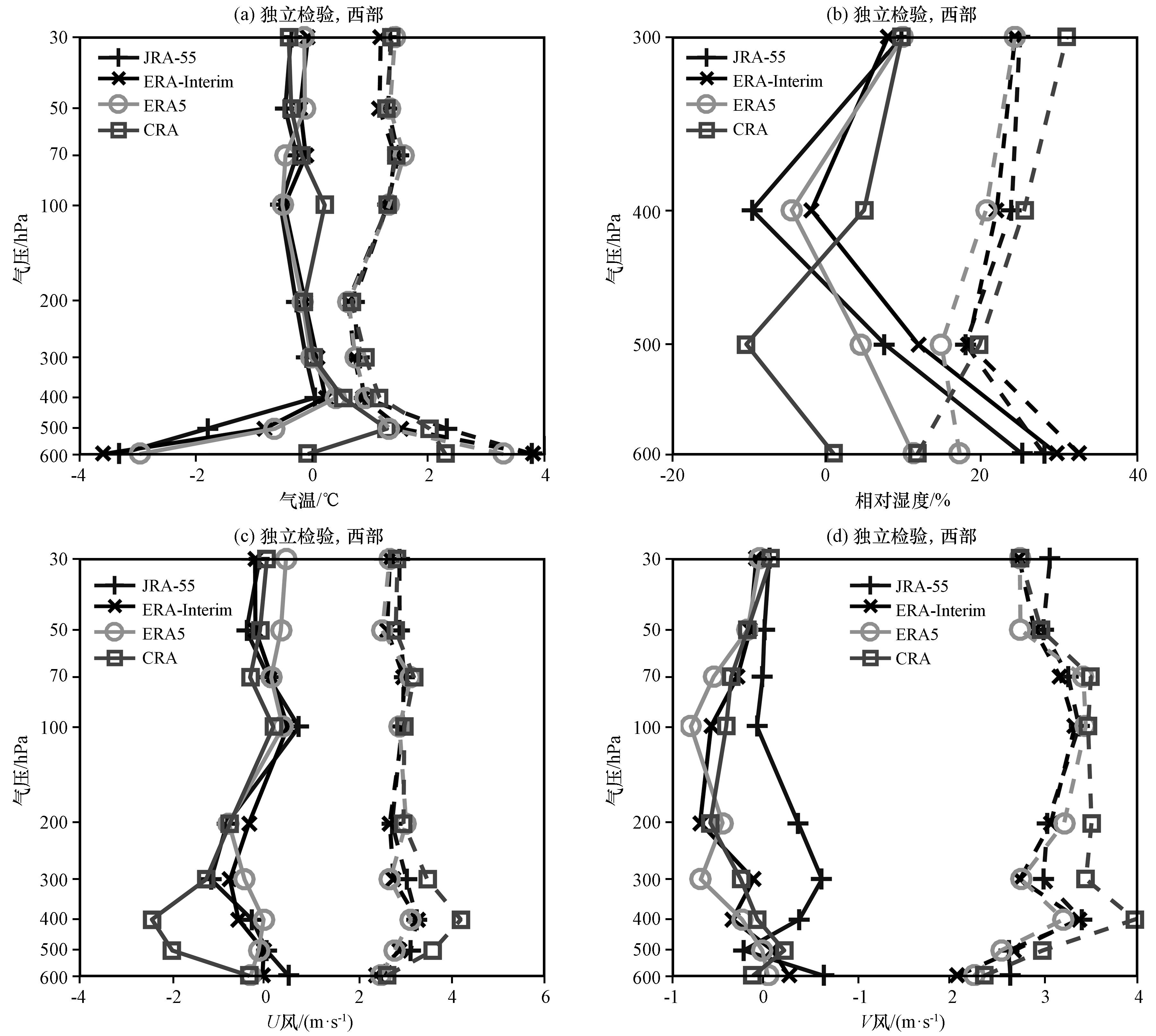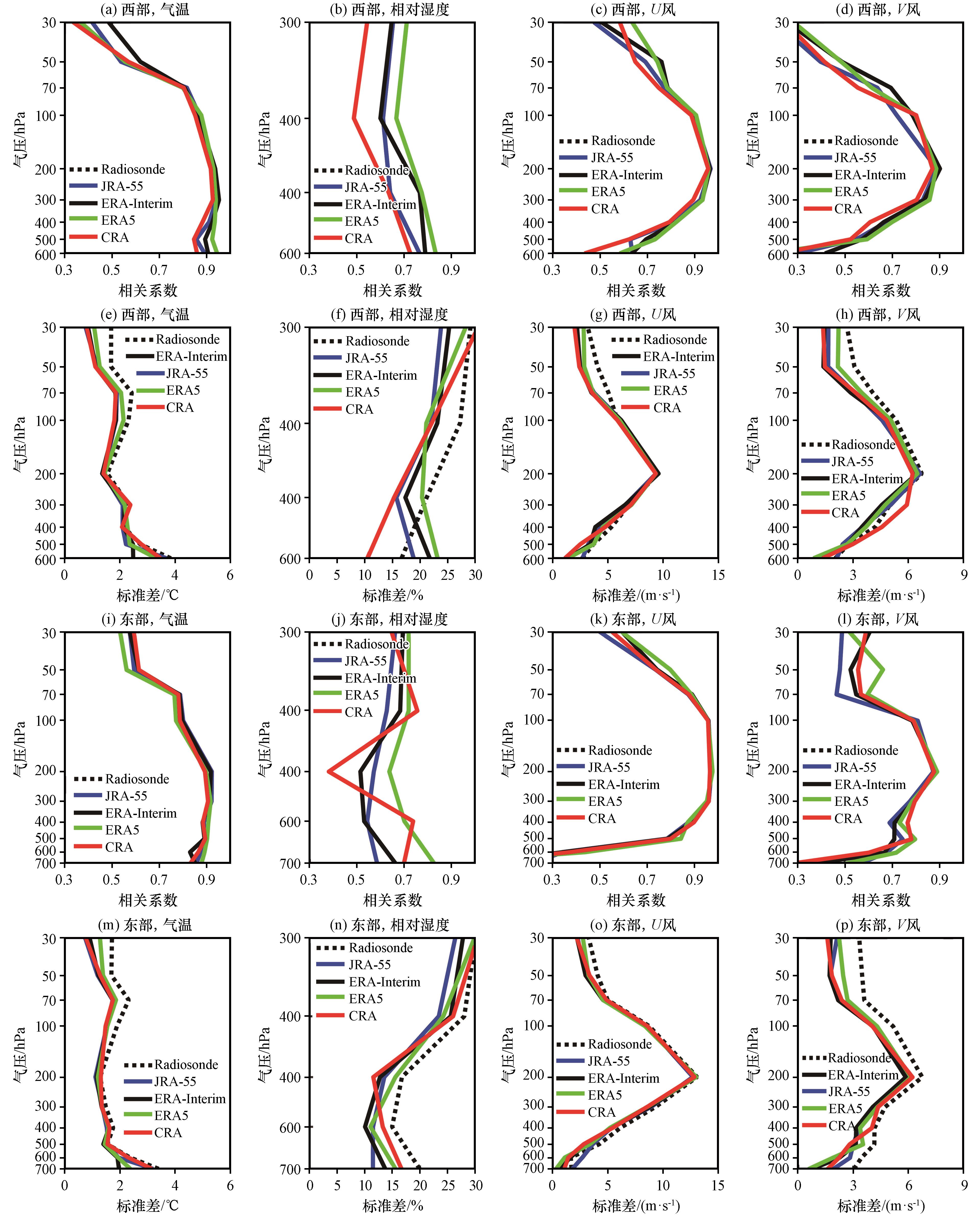 The weather and climate of the Qinghai-Xizang Plateau(QXP)not only exert profound influences on Asian regional climate but also regulate broader Northern Hemisphere climate patterns. Various global atmospheric reanalysis datasets developed abroad have been extensively utilized to characterize the QXP's climate features. In 2020,the China Meteorological Administration released its first-generation global atmospheric reanalysis product(CRA),which demonstrated superior performance in regions with dense conventional observations,yet its skill over the QXP remains unclear. In this study,we performed an independent evaluation of CRA's upper-air temperature,wind fields,and relative humidity using 686 high-quality,non-assimilated radiosonde profiles from five stations collected during June-August 2014 in the 3rd Qinghai-Xizang Plateau Atmospheric Scientific Experiment. A non-independent assessment was also performed using routine observations from 21 sounding stations across the QXP and adjacent areas. Results were compared with those from ERA-Interim,ERA5,and JRA- 55 reanalysis datasets. Non-independent validation results demonstrate that in the troposphere and lower stratosphere,correlation coefficients of temperature and wind speed between CRA and operational radiosonde observations exceed 0. 9. Relative to operational radiosondes,CRA temperature bias of 400 hPa and 500 hPa approaching 0 ℃. The near-surface zonal wind RMSE of CRA is about 2. 5 m·s-1,decreasing gradually with altitude to 1. 5 m·s-1 at 100 hPa. Relative humidity RMSE remains below 20% across all altitude layers. Independent validation results indicate that errors in air temperature and wind speed over the eastern Qinghai-Xizang Plateau are generally smaller than those over the western plateau,whereas relative humidity errors are larger in the east. From 600 hPa to 30 hPa,the mean root-mean-square errors(RMSE)of CRA relative to radiosonde for temperature,zonal wind,and meridional wind are 1. 38 ℃,3. 19 m·s-1,and 3. 22 m·s-1 in the western Qinghai-Xizang Plateau,respectively;and 1. 16 ℃,2. 65 m·s-1,and 2. 90 m·s-1 in the eastern Qinghai-Xizang Plateau,respectively. Errors in the western QXP were slightly larger than in the east and exhibited pronounced diurnal variability. Maximum temperature and relative humidity errors below 600 hPa occur in the afternoon. At 500 hPa,peak relative humidity errors appear in the evening. CRA objectively reproduces the QXP’s vertical structures of temperature,wind speed,and relative humidity. Compared to other reanalysis products,CRA’s relative humidity estimates were closest to radiosonde observations,and wind field errors were slightly higher than those of other datasets but did not exceed 0. 4 m·s-1 on average.