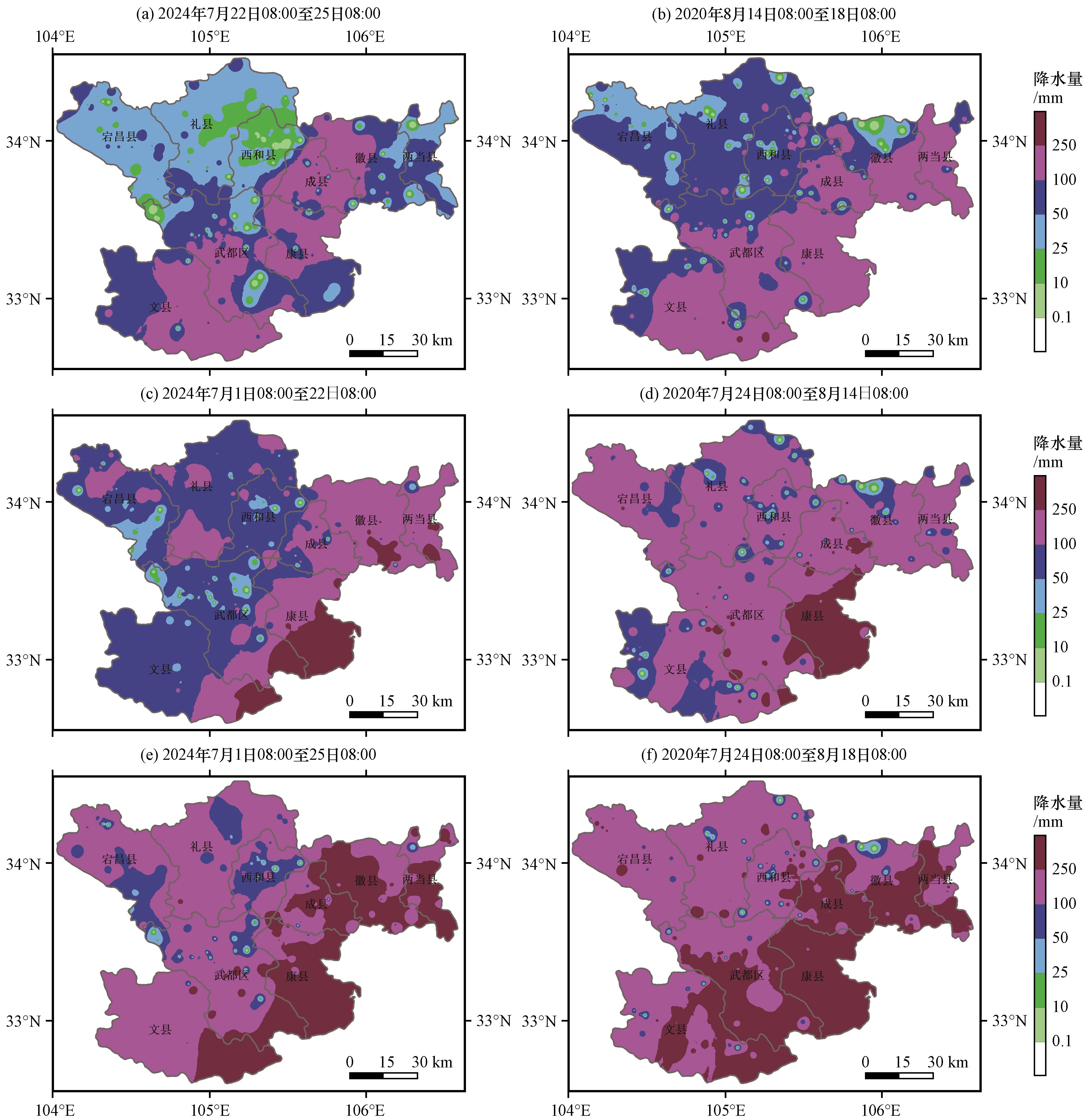 图4 累积降水量(彩色区, 单位: mm)分布(a)2024年7月22日08:00至25日08:00; (b)2020年8月14日08:00至18日08:00; (c)2024年7月1日08:00至22日08:00; (d)2020年7月24日08:00至8月14日08:00; (e)2024年7月1日08:00至25日08:00; (f)2020年7月24日08:00至8月18日08:00Fig.4 Distribution of the cumulated precipitation (colored area, unit: mm).(a)from 08:00 on 22 to 08:00 on 25 July 2024; (b) from 08:00 on 14 to 08:00 on 18 August 2022; (c) from 08:00 on 1 to 08:00 on 22 July 2024; (d) from 08:00 on 24 July to 08:00 on 14 August 2020; (e) from 08:00 on 1 to 08:00 on 25 July 2024; (f) from 08:00 on 24 July to 08:00 on 18 August 2020 |
