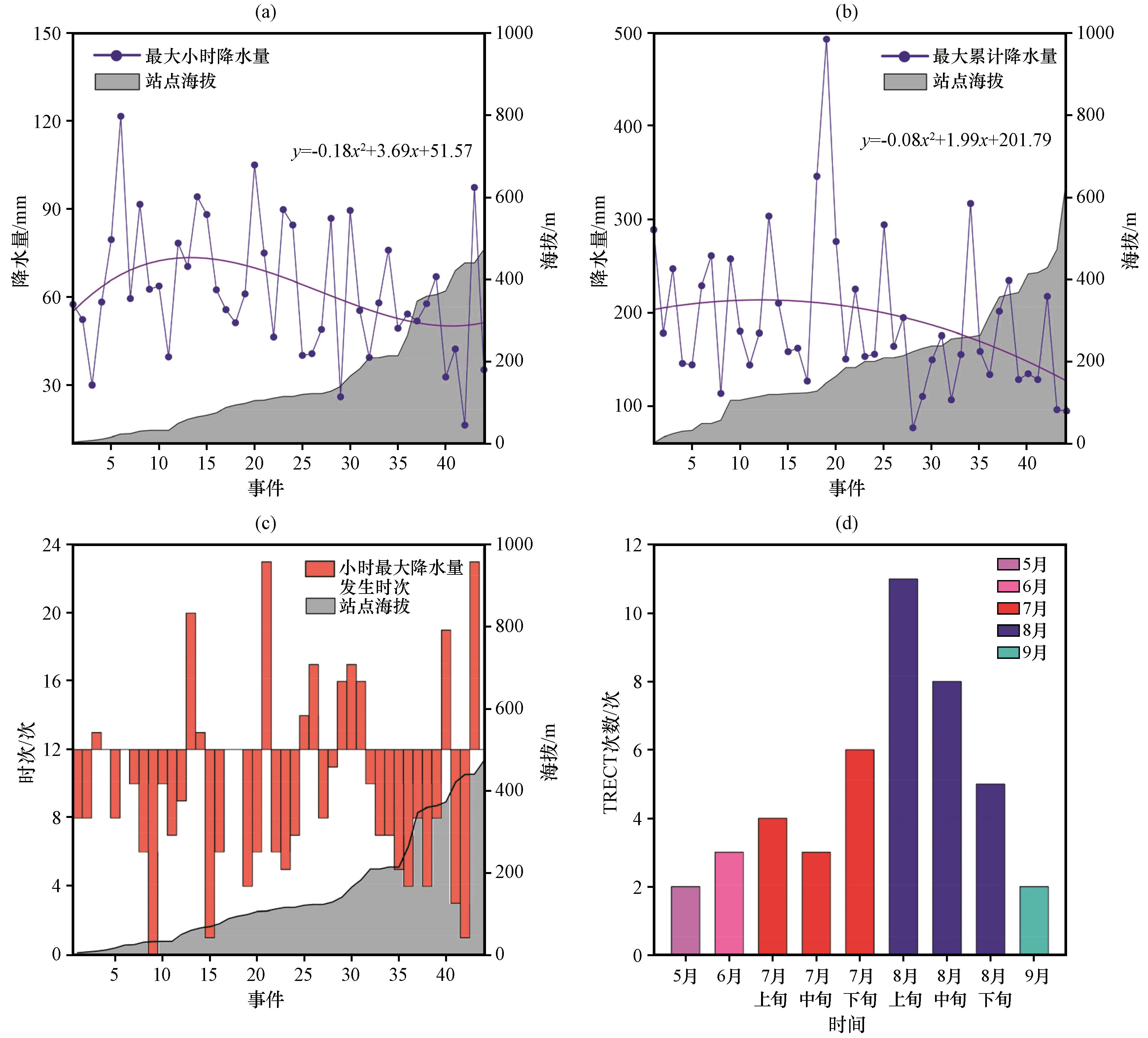 图2 TRECT事件最大小时降水量及其对应台站海拔(a), 最大累计降水量及其对应台站海拔(b), 小时最大降水量发生时次及其对应台站海拔(c), TRECT事件次数时间分布特征(d)Fig.2 TRECT events maximum hourly precipitation and altitude of observation sites (a), maximum accumulated precipitation and altitude of observation sites (b), hourly maximum precipitation times and altitude of observation sites (c), time distribution characteristics (d) |