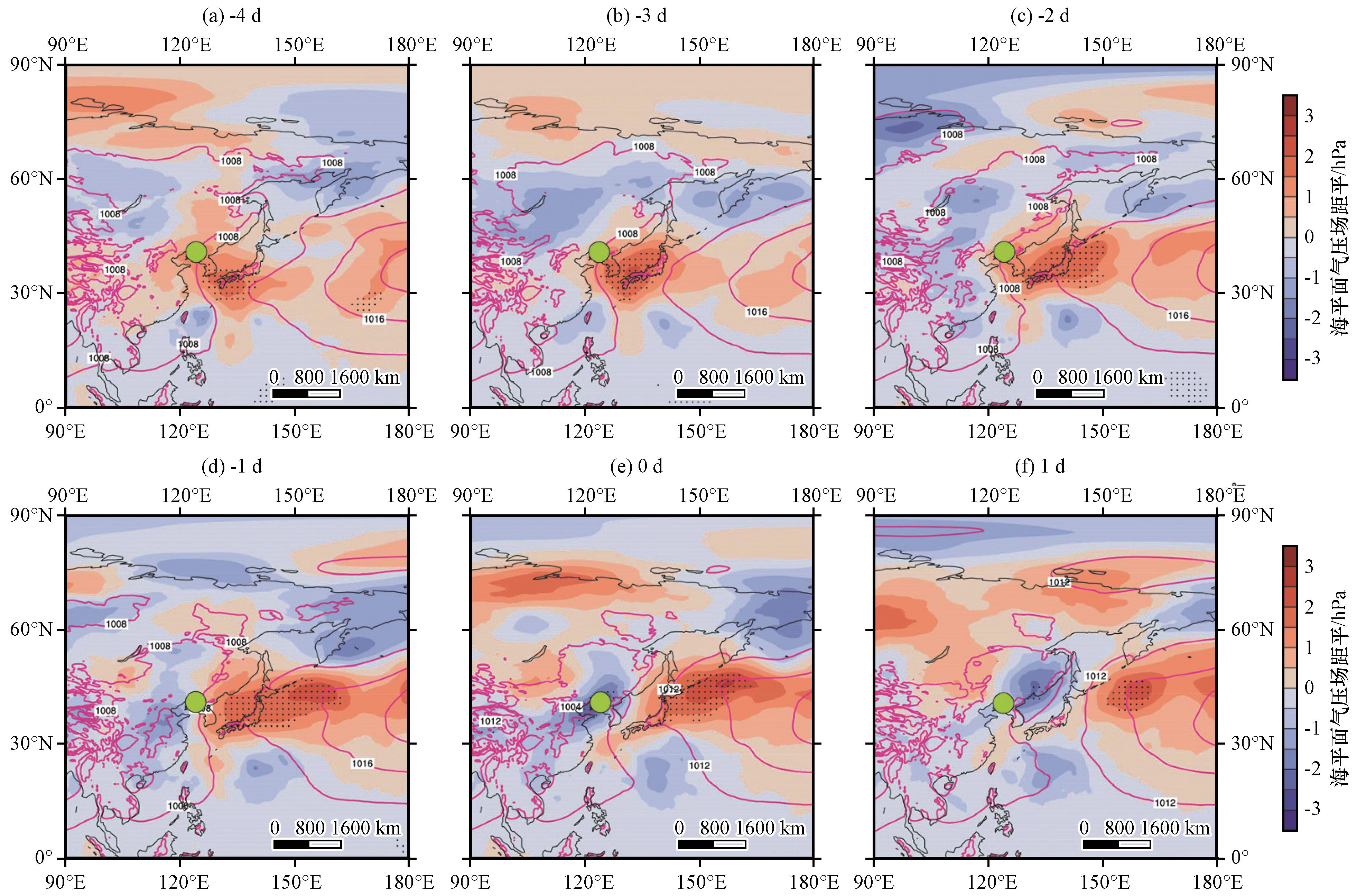 图4 44个TRECT事件-4天(a), -3天(b), -2天(c), -1天(d), 0天(e), 1天(f)的海平面气压场(等值线)及其距平场合成(填色)分布(单位: hPa)黑色点区表示合成的海平面气压场距平通过 95%信度检验, “0天”表示事件开始日, “-n(n)天”表示事件发生前(后) 第n天, 绿色大圆点指关键区位置 Fig.4 Composite time evolutions of SLP (contours) and its anomalies (colored shading) for the 44 TRECTs on the -4 day(a), -3 day(b), -2 day(c), -1 day(d), 0 day(e), 1 day (f) (unit: hPa).The black dots indicate the composited SLP anomalies have passed the 95% confidence level.“0 d” denotes the start day, “-n (n) d” denotes the n day before (after) the beginning of the event.Green large circles indicate the key area locations |