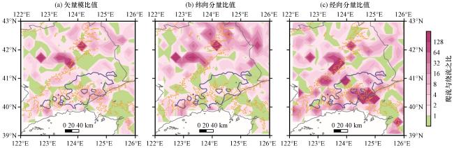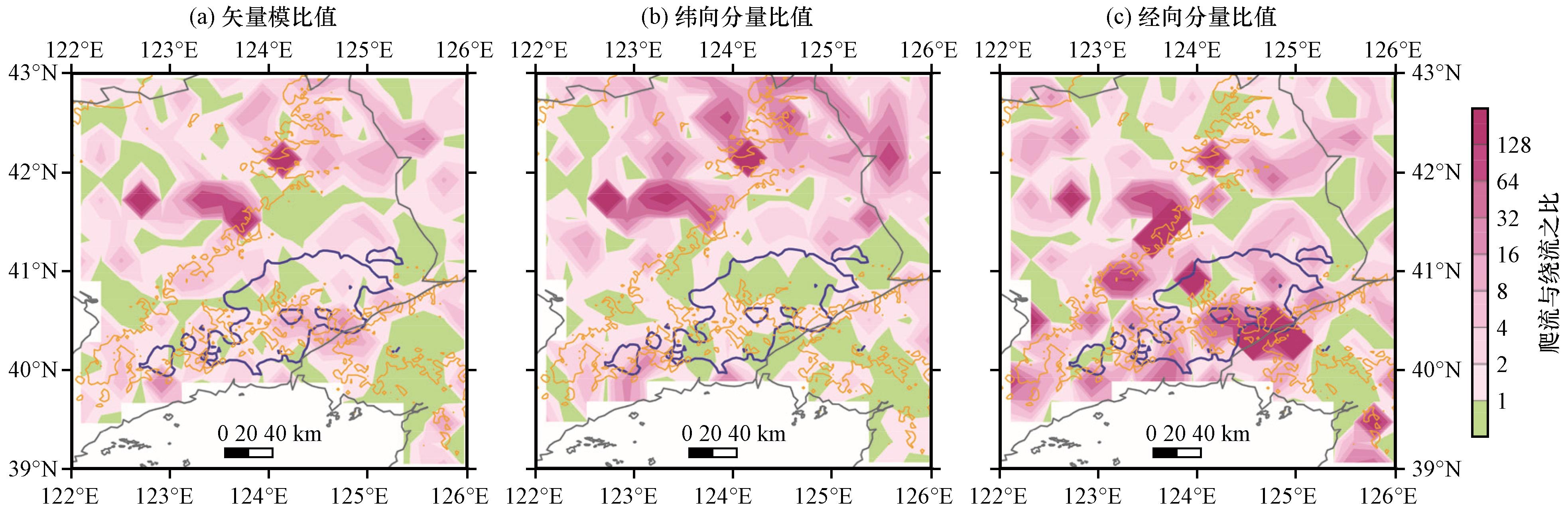 图8 44个TRECT事件鼎盛期爬流和绕流矢量模比值(a)、 纬向分量比值(b)、 经向分量比值(c) (填色)橙色等值线表示200 m地形等值线, 蓝色等值线为50 mm降水区 Fig.8 Ratio of flow over and flow (shading) around vector modes (a), zonal component (b), meridional component (c) during the peak period of the 44 TRECT events.The orange contour line represents the 200 m terrain heightThe blue contour line represents a 50 mm precipitation area |