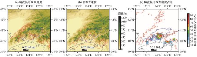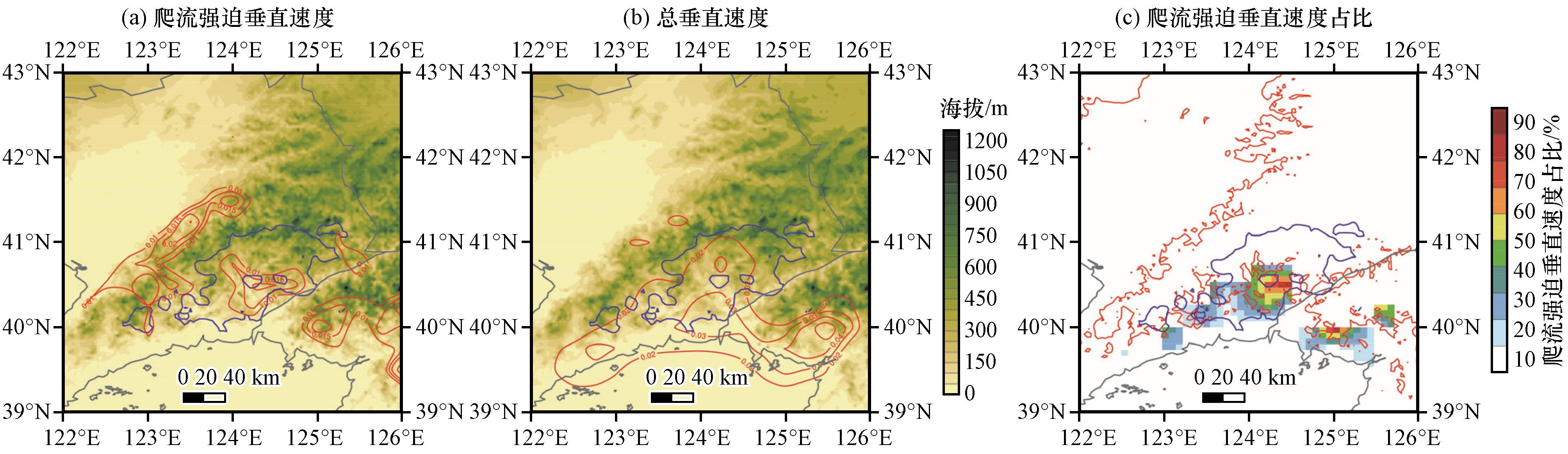 图9 44个TRECT事件950 hPa鼎盛期爬流合成强迫垂直速度(a, 红色等值线, 单位: m·s-1)、 ERA5合成总垂直速度(b, 红色等值线, 单位: m·s-1)及爬流强迫垂直速度占比(c, 填色, 单位: %)蓝色等值线为50 mm降水区, (a, b)中填色为海拔(单位: m),(c)中红色等值线表示200 m地形等值线 Fig.9 Composite vertical velocity forced by the flow over (a) and ERA5(b) (the red contour line, unit: m·s-1), and the proportion of forced vertical velocity in flow over at 950 hPa during the peak period of the 44 TRECTs(c, colored shading, unit: %).In (a) and (b), colored shading denotes elevation (unit: m), the blue contour line represents a 50 mm precipitation area.The red contour line in picture (c) represents the 200 m terrain height |
