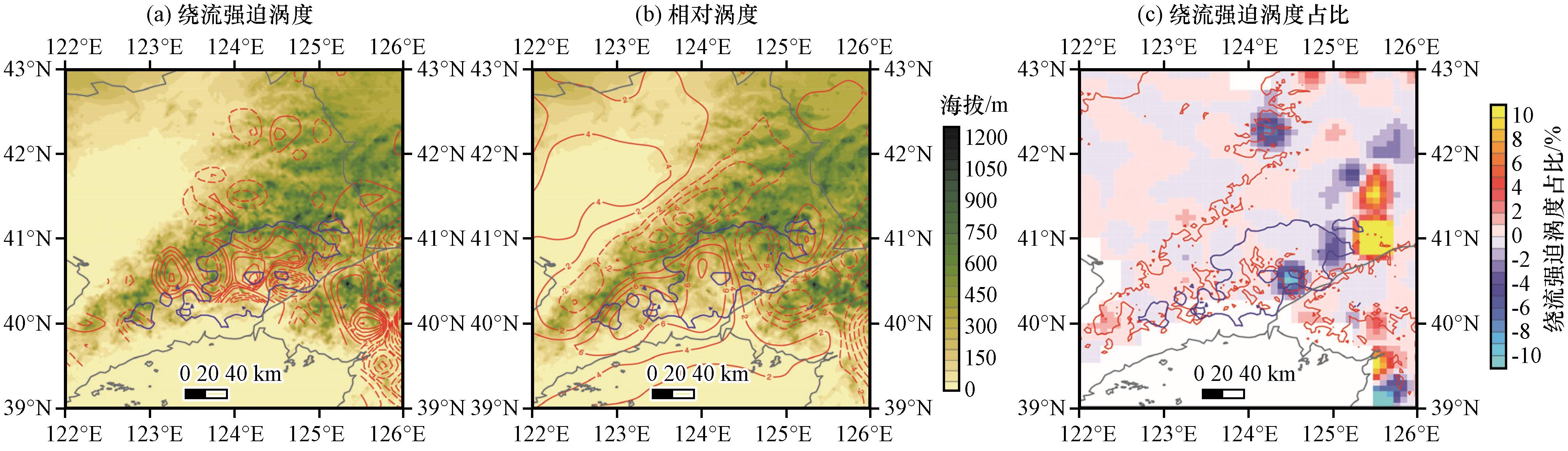 图10 44个TRECT事件950 hPa鼎盛期绕流合成强迫产生涡度(a, 红色等值线, 单位: ×10-6 rad·s-1)、 ERA5合成相对涡度(b, 红色等值线, 单位: ×10-5 rad·s-1)及绕流强迫涡度占比(c, 填色, 单位: %)(a), (b)中填色为海拔(单位: m), 蓝色等值线为50 mm降水区, (c)中红色等值线表示200 m地形等值线 Fig.10 Composite vorticity generated forced by the flow around (a, the red contour line, unit: ×10-6 rad·s-1), ERA5 (b, the red contour line, unit: ×10-5 rad·s-1) and the proportion of forced vertical generated in flow around at 950 hPa during the peak period of the 44 TRECTs (c, colored shading, unit: %).In (a) and (b), colored shading denotes elevation (unit: m), the blue contour line represents a precipitation area 50 mm.The red contour line in picture (c) represents the 200 m terrain height |