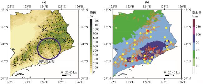 图1 辽宁区域海拔(填色, 单位: m)及复杂地形区域台站位置(黑点)(a), 44个TRECT事件日均降水量(b, 单位: mm)(b)中红点为小时降水量前20%的台站, 黄点为其余台站 Fig.1 The altitude in the Liaoning region (colored shading, unit: m) and the location of stations in complex terrain areas (the black dots) (a), the daily average precipitation of the 44 TRECT events (b, unit: mm). The red dots in the figure (b) represent the top 20% of stations in terms of hourly precipitation, while the yellow dots represent the remaining stations |