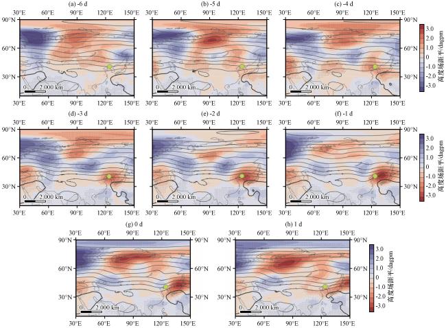 图3 44个TRECT事件-6天(a), -5天(b), -4天(c), -3天(d), -2天(e), -1天(f), 0天(g), 1天(h)的500 hPa高度场(等值线)及其距平场合成(填色)分布(单位: dagpm)打点区表示合成的500 hPa高度距平通过 95%信度检验, “0天”表示事件开始日, “-n(n)天”表示事件发生前(后) 第n天, 绿色大圆点指关键区位置 Fig.3 Composite of Z500 (contours) and its anomalies (colored shading) for the 44 TRECTs on the -6 day (a), -5 day (b), -4 day (c), -3 day (d), -2 day (e), -1 day (f), 0 day (g), 1 day (h) (unit: dagpm).The black dots indicate the composited Z500 anomalies have passed the 95% confidence level.“0 d” denotes the start day, “-n (n) d” denote the n day before (after) the beginning of the event.Green large circles indicate the key area locations |