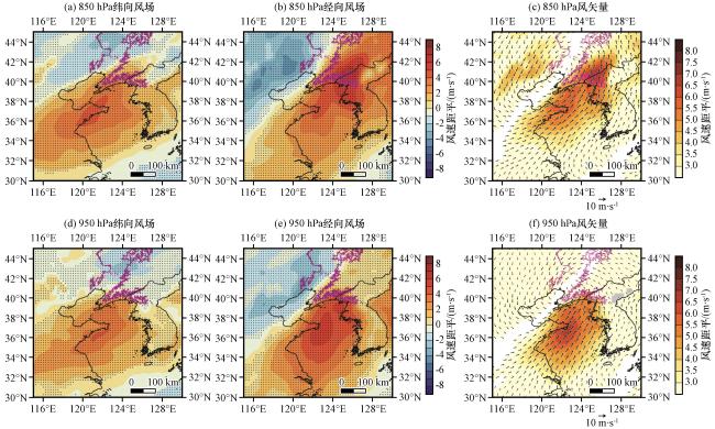 图5 44个TRECT事件鼎盛期850 hPa(a~c)和950 hPa(d~f)纬向风场(a, d)、 经向风场(b, e)、 风矢量(c, f)及其距平场合成分布(填色, 单位: m·s-1)紫色等值线表示200 m地形等值线, (c)和(f)中矢量表示风速大小(单位: m·s-1)(a、 b、 d、 e)中打点区及(c、 f)中风矢量区表示距平通过95%信度检验 Fig.5 Composite distribution of wind vector anomalies in the peak period of the 44 TRECT events at 850 hPa (a-c) and 950 hPa (d-f), zonal wind(a, d), meridional wind(b, e), and wind vector(c, f) (colored shading) (unit: m·s-1).The purple contour line represents the 200 m terrain height (unit: m), with black dots areas in (a, b, d, e) and wind vector (c, f) indicate the composited anomalies have passed the 95% confidence level |