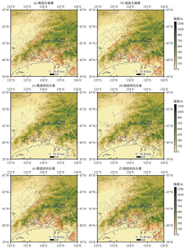 图6 44个TRECT事件鼎盛期爬流(左)和绕流(右)矢量模(a, b)、 纬向分量(c, d)、 经向分量(e, f)合成场(等值线, 单位: m·s-1)填色为海拔(单位: m), 红色等值线为大于4 m·s-1的爬流(a、 c、 e)和绕流(b、 d、 f), 蓝色等值线为50 mm降水区 Fig.6 Composite distribution of the peak period of the 44 TRECTs: flow over (left), flow around (right) vector mode (a, b), zonal component (c, d), meridional component (e, f) (contours, unit: m·s-1).Colored shading denotes elevation (unit: m).The red contour line represents the flow over(a, c, e) and flow around (b, d, f) with values greater than 4 m·s-1.The blue contour line represents the 50 mm precipitation area |