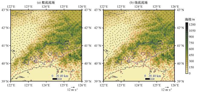 图7 44个TRECT事件鼎盛期爬流(a)和绕流(b)合成流场分布(矢量, 单位: m·s-1)填色为海拔(单位: m), 红色箭头为大于4 m·s-1的爬流(a)和绕流(b), 蓝色等值线为50 mm降水区 Fig.7 Composite Flow field distribution of flow over (a) and flow around (b) during the peak period of the 44 TRECTs (vector, unit: m·s-1) Colored shading denotes elevation (unit: m).The red arrow represents the flow over (a) and flow around (b) with values greater than 4 m·s-1.The blue contour line represents the 50 mm precipitation area |