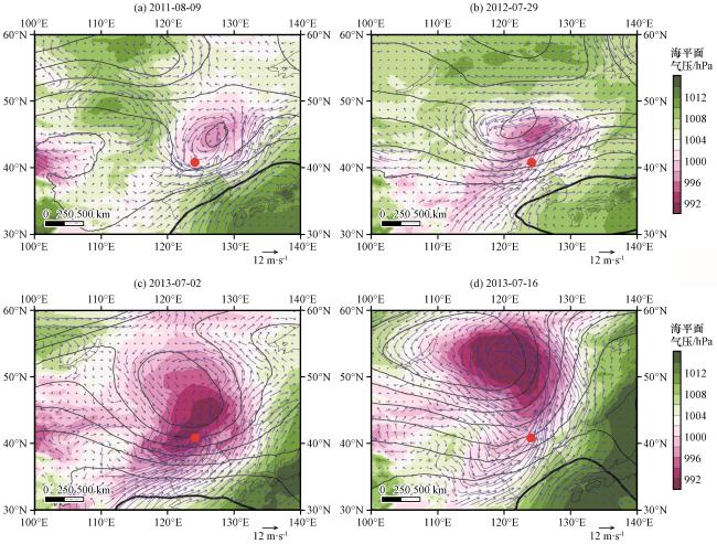 图11 4次TRECT事件2011年8月9日(a)、 2012年7月29日(b)、 2013年7月2日(c)、 2013年7月16日(d)500 hPa位势高度场(黑色等值线, 单位: dagpm)、 海平面气压场(填色, 单位: hPa)、 850 hPa流场(蓝色风矢量, 单位: m·s-1)(红点为关键区位置)Fig.11 Four TRECT events showing: 9 August 2011 (a), 29 July 2012 (b), 2 July 2013 (c), 16 July 2013 (d).Plotted elements include: 500 hPa geopotential height field (black contours, unit: dagpm), sea level pressure field(colored shading, unit: hPa), 850 hPa flow field (blue wind vectors, unit: m·s¹).Red dots denote the key region locations |