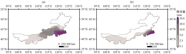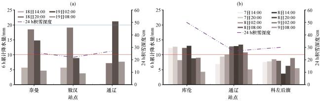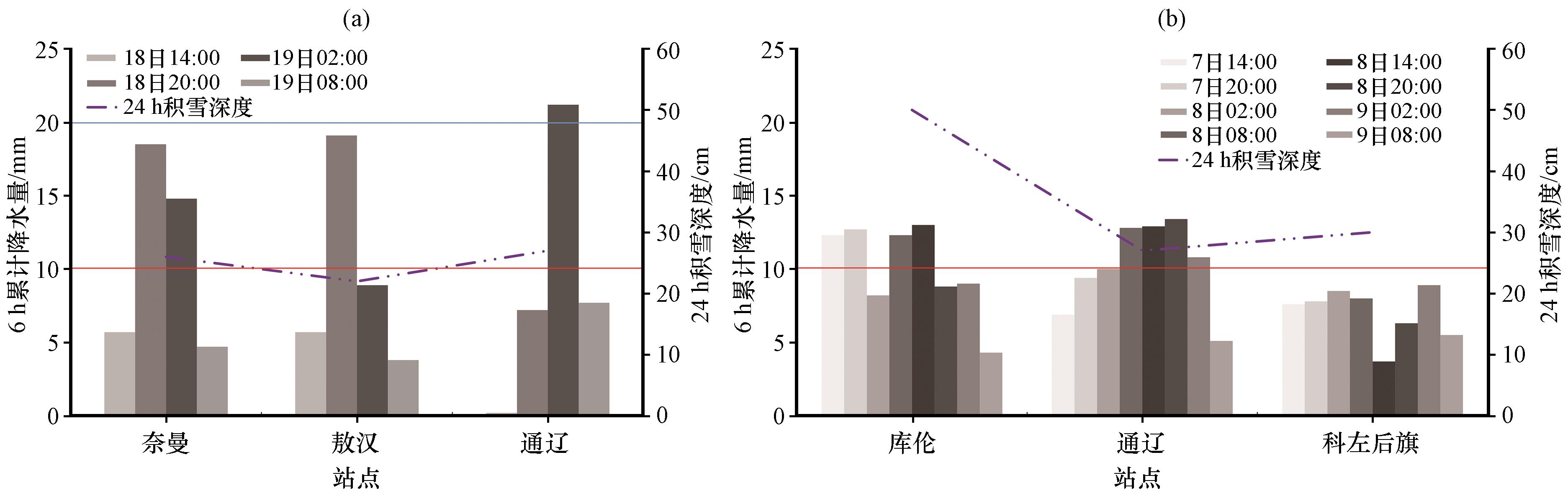 图2 2020年11月18日08:00至19日08:00 (a)、 2021年11月7日08:00至8日08:00 (b)降水量最大的3个站的6 h降水量演变、 24 h积雪深度红线: 6 h累计降水量10 mm线, 蓝线: 6 h累计降水量20 mm线 Fig.2 Evolution of 6-hour precipitation and 24-hour snow depth at the three stations with the largest precipitation from 08:00 on 18 to 08:00 on 19 November, 2020 (a), and from 08:00 on 7 to 08:00 on 8 November 2021 (b).Red line represents 6 h accumulated precipitation of 10 mm line; blue line reprsents 6 h accumulated precipitation of 20 mm line |