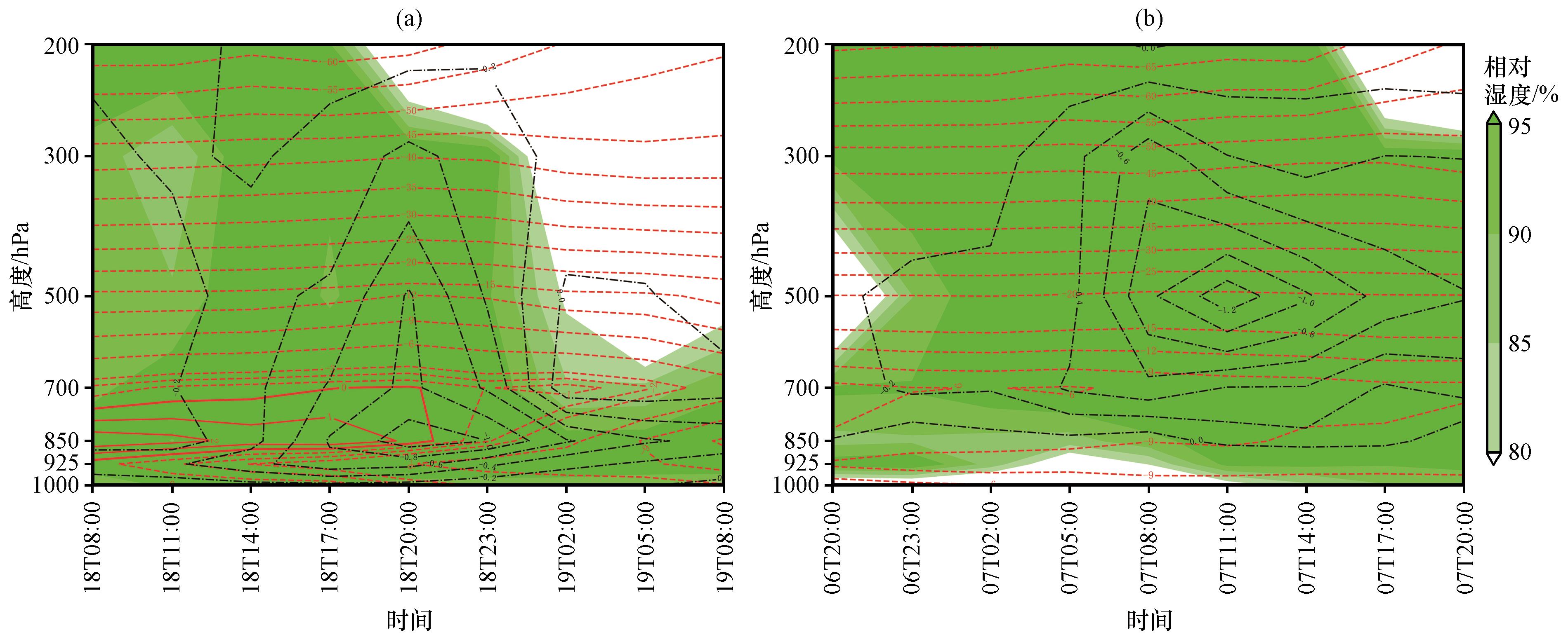 图4 2020年11月18日08:00至19日08:00(a)沿暴雪中心(121.75°E, 42.75°N)、 2021年11月6日20:00至7日20:00 (b)沿暴雪中心(121°E, 42.25°N)相对湿度(填色, 单位: %)、 垂直速度(黑色等值线, 单位: Pa·s-1)、 温度(红色等值线, 单位: ℃)的时间-高度剖面Fig.4 Time-height cross sections of relative humidity (shading, unit: %), vertical velocity (black contour, unit: Pa·s-1), and temperature (red contour, unit: ℃) along the center of the blizzard (121.75°E, 42.75°N) from 08:00 on November 18 to 08:00 on November 19, 2020 (a), and along the center of the blizzard (121°E, 42.25°N) from 20:00 on November 6 to 20:00 on November 7, 2021 (b) |