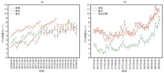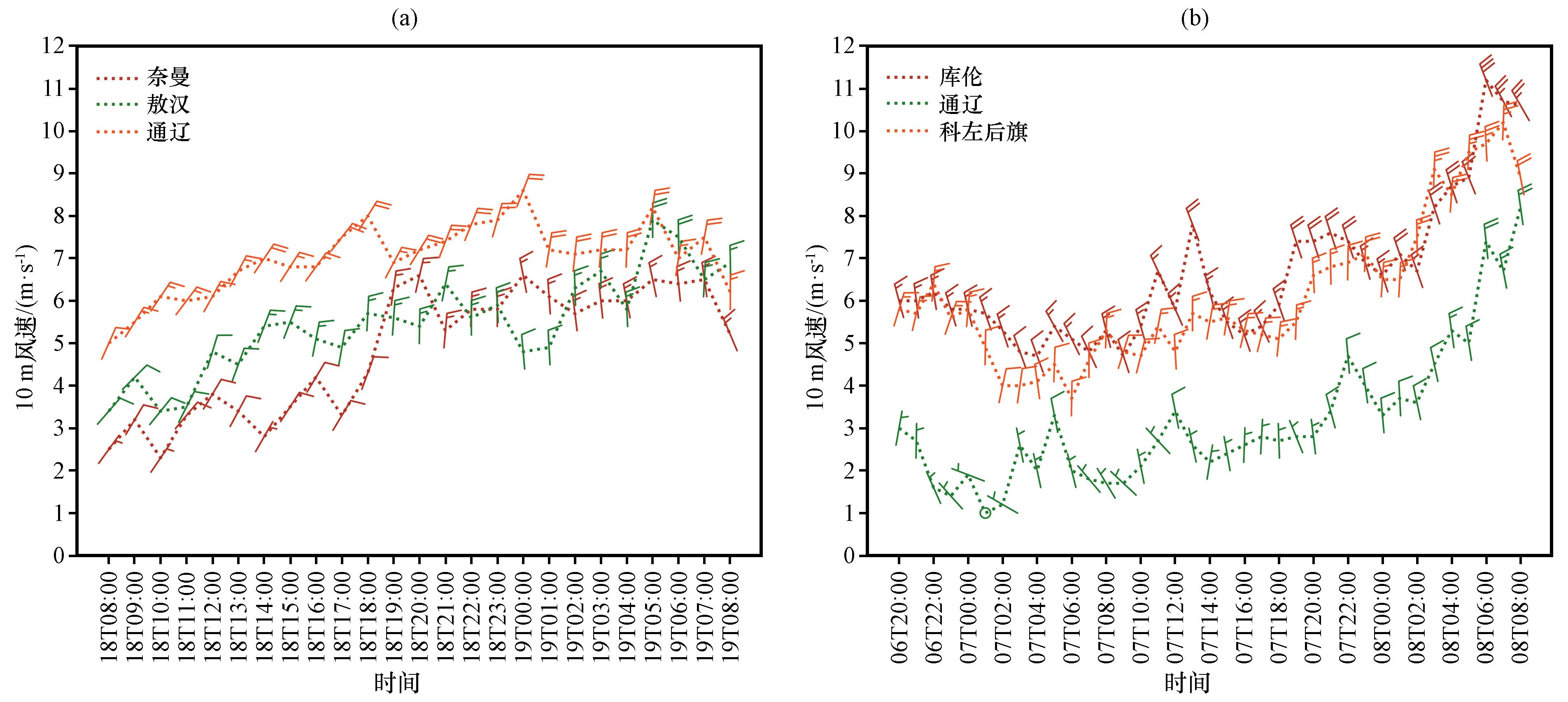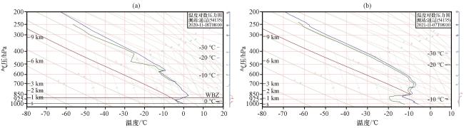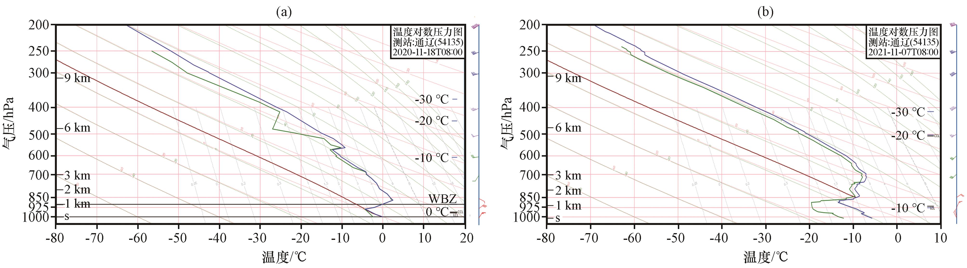 图5 2020年11月18日08:00(a)、 2021年11月7日08:00(b)通辽站温度对数压力图Fig.5 Temperature logarithmic pressure graph at Tongliao station at 08:00 on 18 November 2020 (a) and at 08:00 on 7 November 2021 (b) |