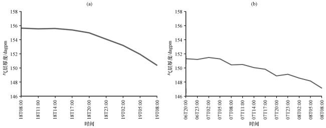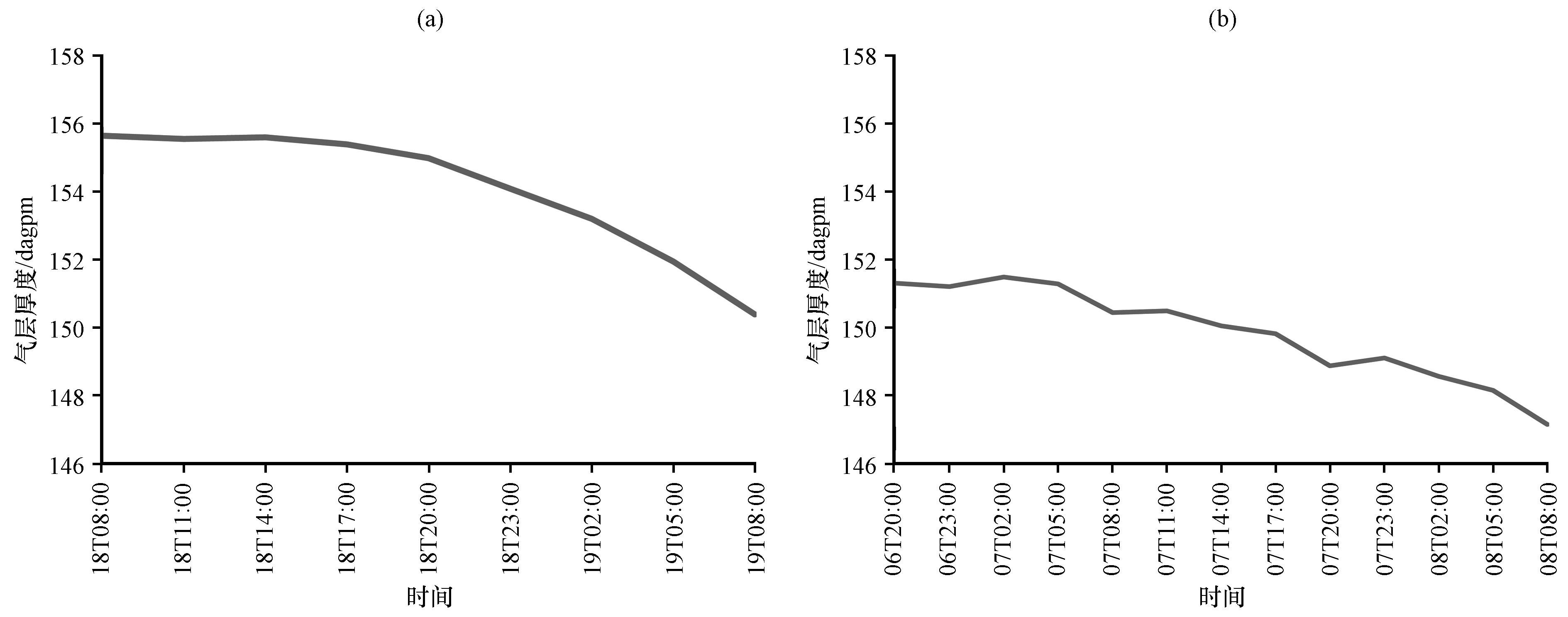 图6 2020年11月18日08:00至19日08:00(a)沿暴雪中心(120.75°E, 42.75°N)、 2021年11月6日20:00至8日08:00 (b)沿暴雪中心(122°E, 42.75°N)大气暖层700~850 hPa厚度随时间演变Fig.6 Evolution of the thickness of the atmospheric warm layer (700~850 hPa) along the center of the blizzard (120.75°E, 42.75°N) from 08:00 on November 18 to 08:00 on November 19, 2020 (a), and along the center of the blizzard (122°E, 42.75°N) from 20:00 on November 6 to 08:00 on November 8, 2021 (b) |