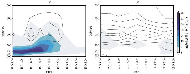 图7 2020年11月18日08:00至19日08:00(a)沿暴雪中心(120.75°E, 42.75°N)和2021年11月7日08:00至8日08:00(b)沿暴雪中心(122°E, 42.75°N)的云中冰含量(等值线, 单位: ×10-5 kg·kg-1)、 云中液态水含量(填色, 单位: ×10-5 kg·kg-1)的时间-高度剖面Fig.7 Time-height cross sections of cloud ice content (contour, unit: ×10-5 kg·kg-1) and cloud liquid water (shading, unit: ×10-5 kg·kg-1) along the center of the blizzard (120.75°E, 42.75°N) from 08:00 on 18 November 2020 to 08:00 on 19 November 2020 (a) and along the center of the blizzard (122°E, 42.75°N) at 08:00 on 7 November 2021 to 08:00 on 8 November 2021 (b) |