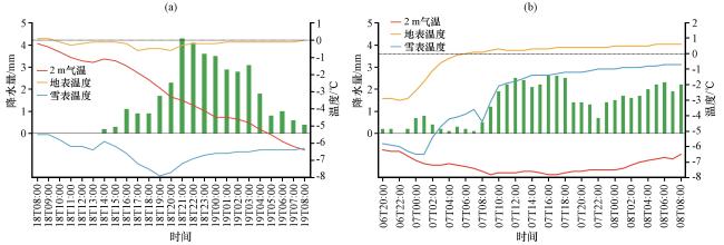 图8 2020年11月18日08:00至19日08:00通辽站(a)、 2021年11月6日20:00至8日08:00库伦站(b)2 m气温、 地表温度、 雪表温度、 逐小时降水量随时间演变Fig.8 Evolution of 2-m air temperature, surface temperature, snow surface temperature, and hourly precipitation with time at Tongliao station from 08:00 on November 18 to 08:00 on November 19, 2020 (a), and Kuerlen station from 20:00 on November 6 to 08:00 on November 8, 2021 (b) |
