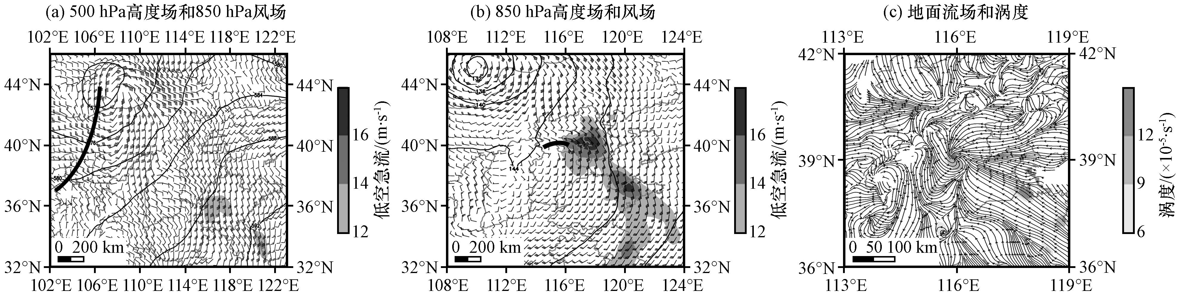 图2 2020年8月12日08:00 (a)和20:00 (b)位势高度场(等值线, 单位: dagpm)与风场(风羽, 单位: m·s-1, 阴影为低空急流)及20:00流场与涡度(阴影, 单位: ×10-5 s-1) (c)Fig.2 The geopotential height (contour lines, unit: dagpm) and wind field (barb, unit: m·s-1, shading is low-level jet stream) at 08:00 (a) and 20:00 (b), the flow field and vorticity (shading, unit: ×10-5 s-1) at 20:00 (c) on August 12, 2020 |