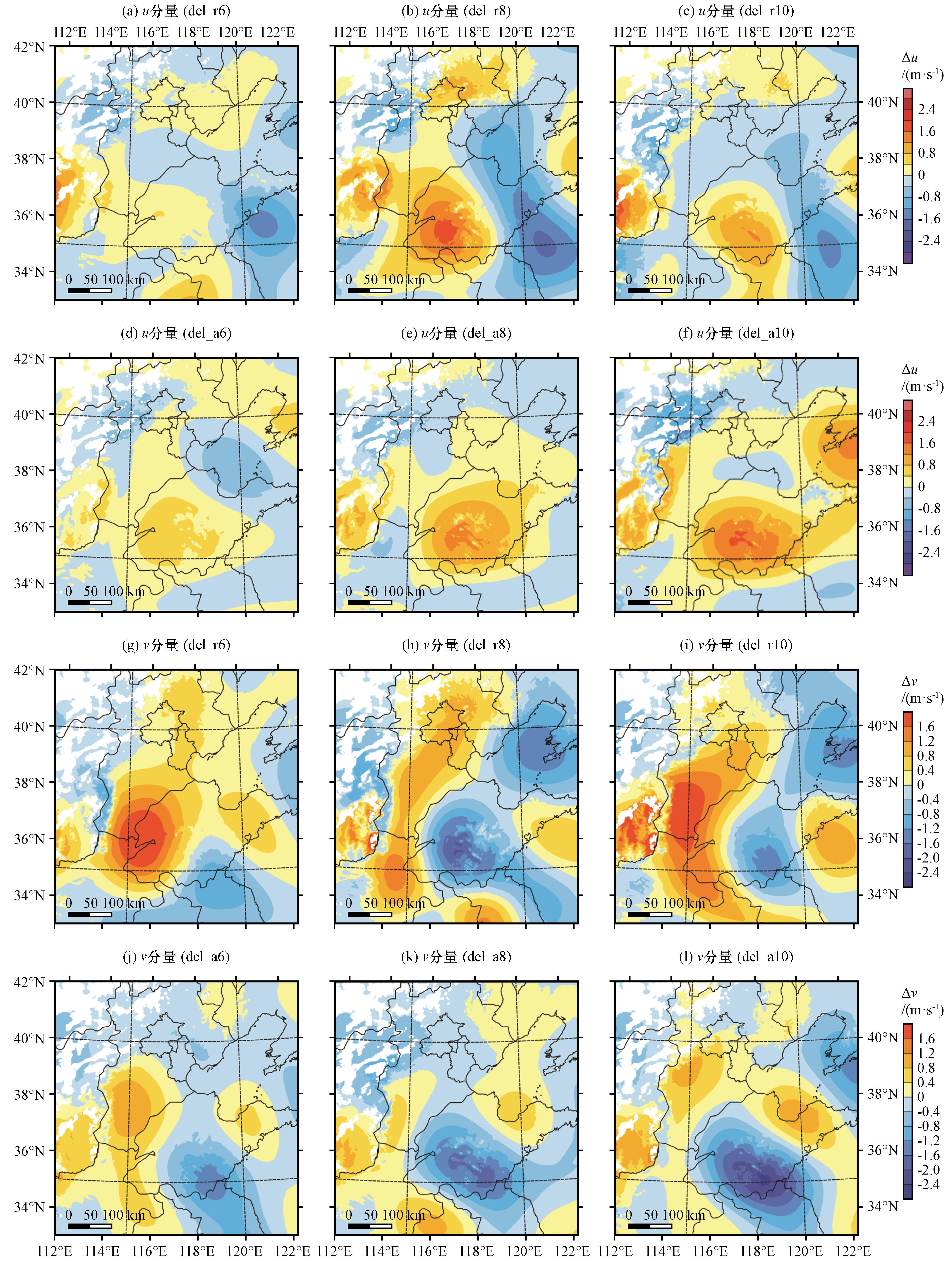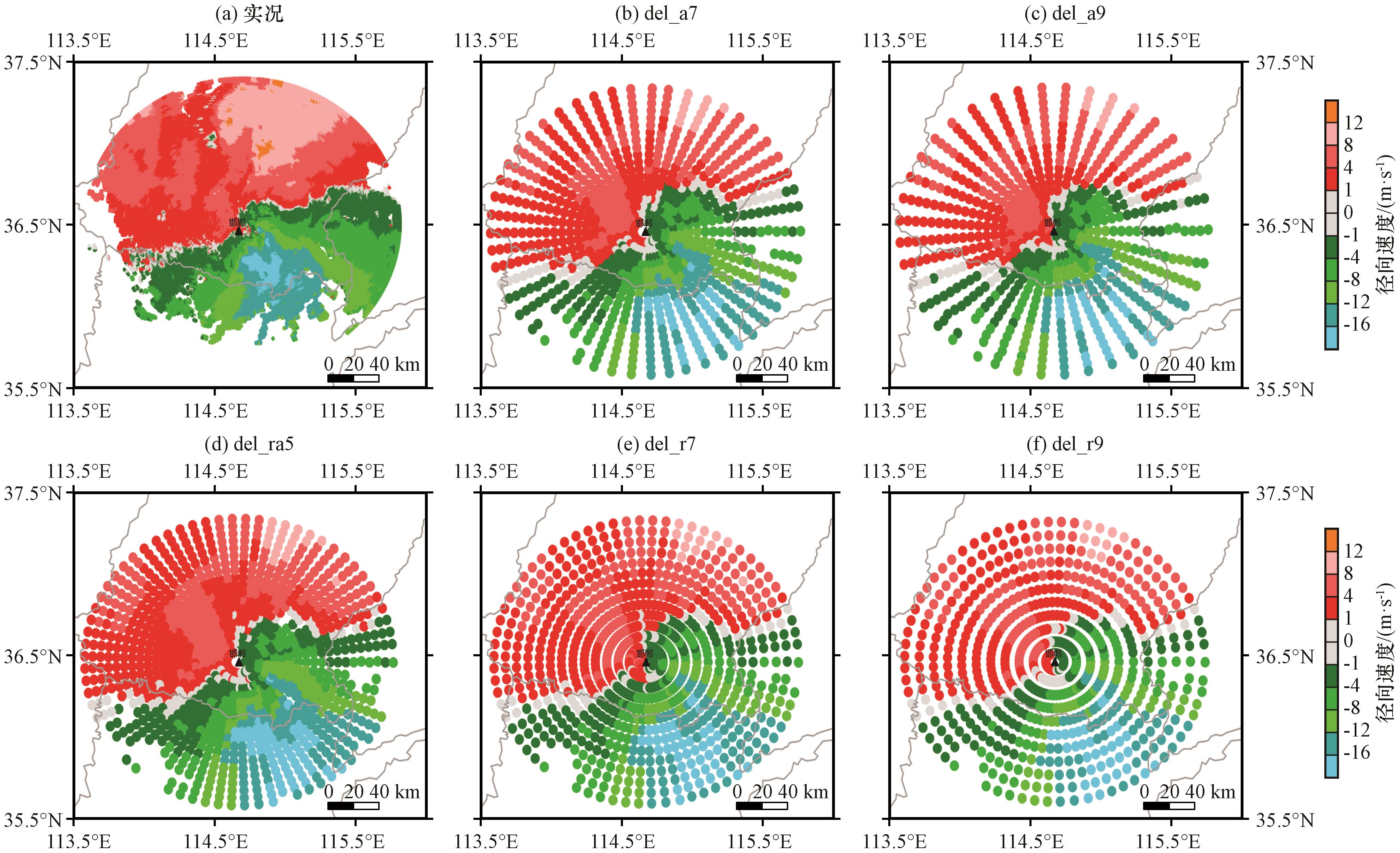 图3 2020年8月12日08:00邯郸站1.5°仰角层雷达径向风观测和各试验的SO分布(单位: m·s-1)(a)实况, (b)del_a7, (c)del_a9, (d)del_ra5, (e)del_r7, (f)del_r9Fig.3 Radar radial wind observations and SO distribution from each experiments at 1.5°elevation of Handan at 08:00 August 12, 2020.Unit: m·s-1.(a) observations, (b) del_a7, (c) del_a9, (d) del_ra5, (e) del_r7, (f) del_r9 |