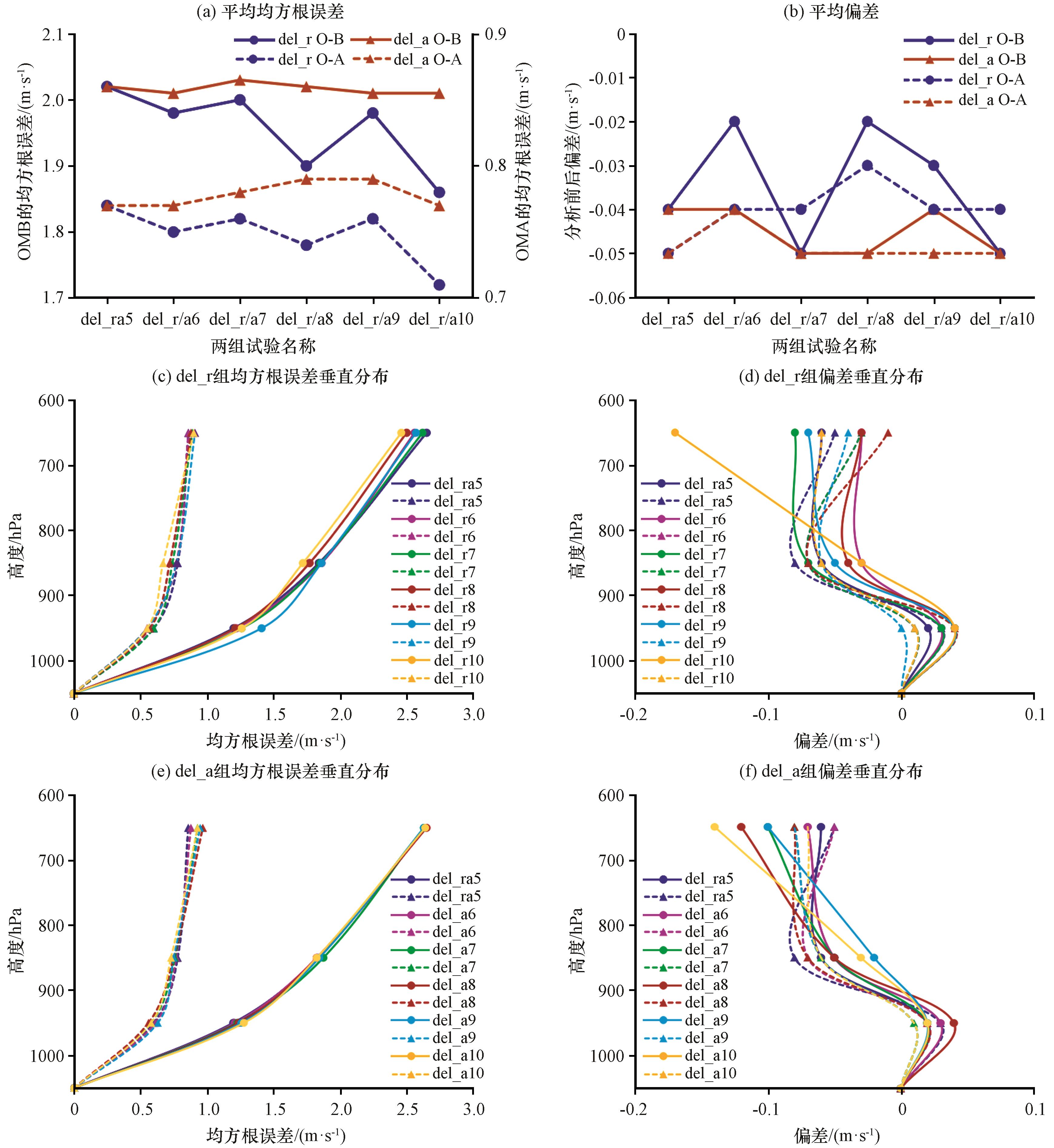 图5 两组试验同化前后OMB(实线)和OMA(虚线)的均方根误差及偏差 (a)平均均方根误差, (b)平均偏差, (c, d)del_r组均方根误差和偏差的垂直分布, (e, f)del_a组均方根误差和偏差的垂直分布Fig.5 Root mean square error (RMSE) and bias from the SO minus background (OMB, solid lines) and observation minus analysis (OMA, dashed lines) of two groups experiment before and after data assimilation.(a) mean RMSE, (b) mean bias, (c, d) vertical distribution of RMSE and bias in the del_r group, (e, f) vertical distribution of RMSE and bias in the del_a group |