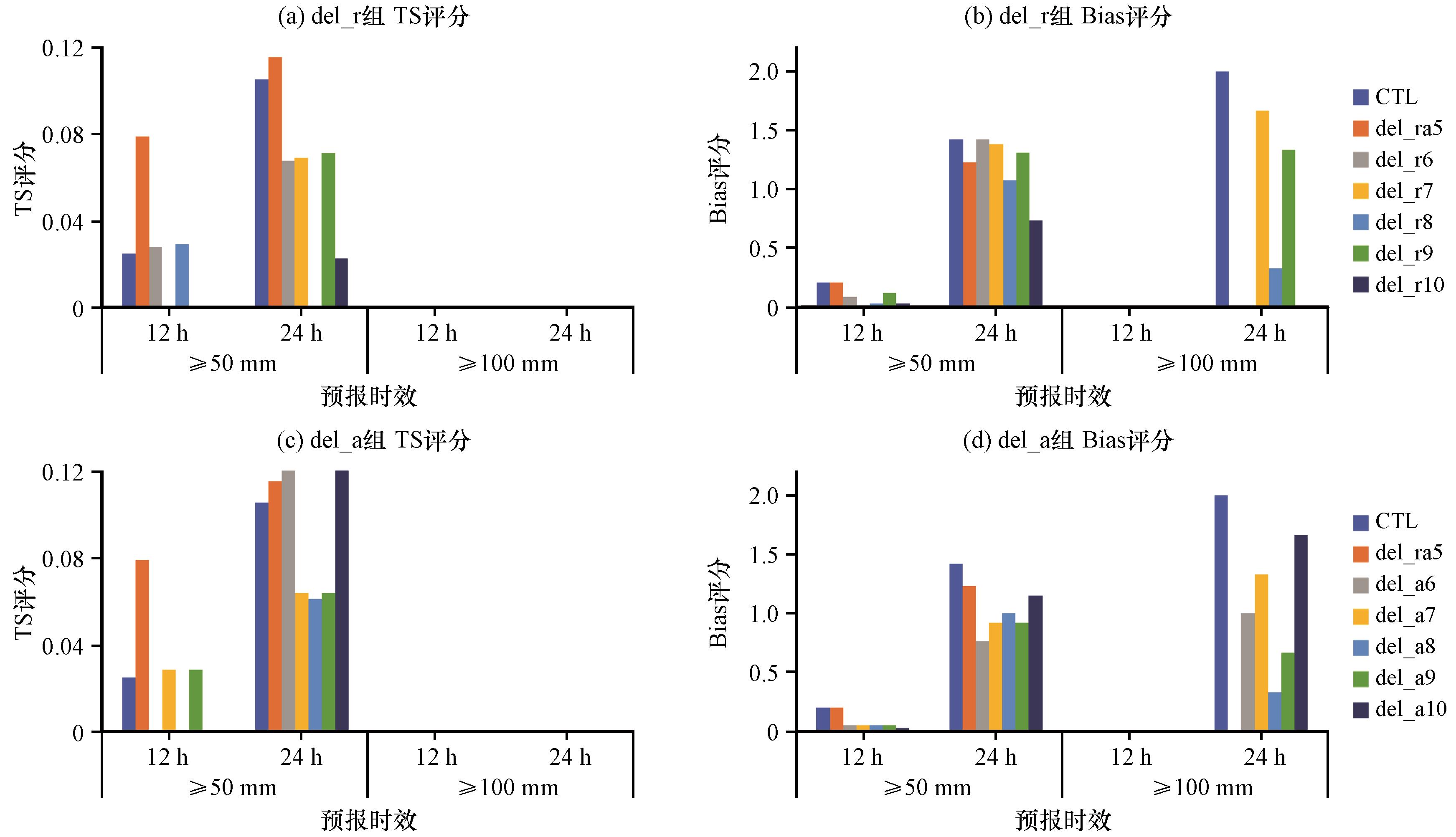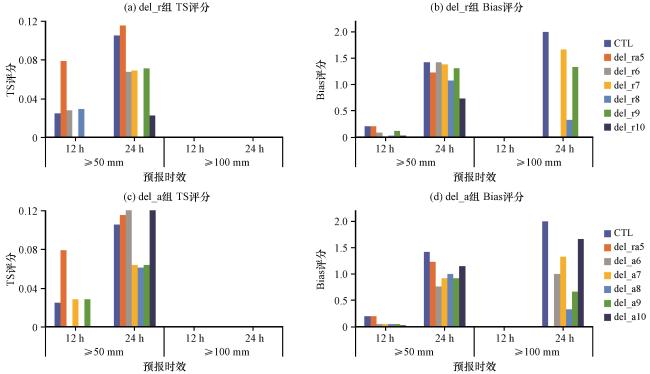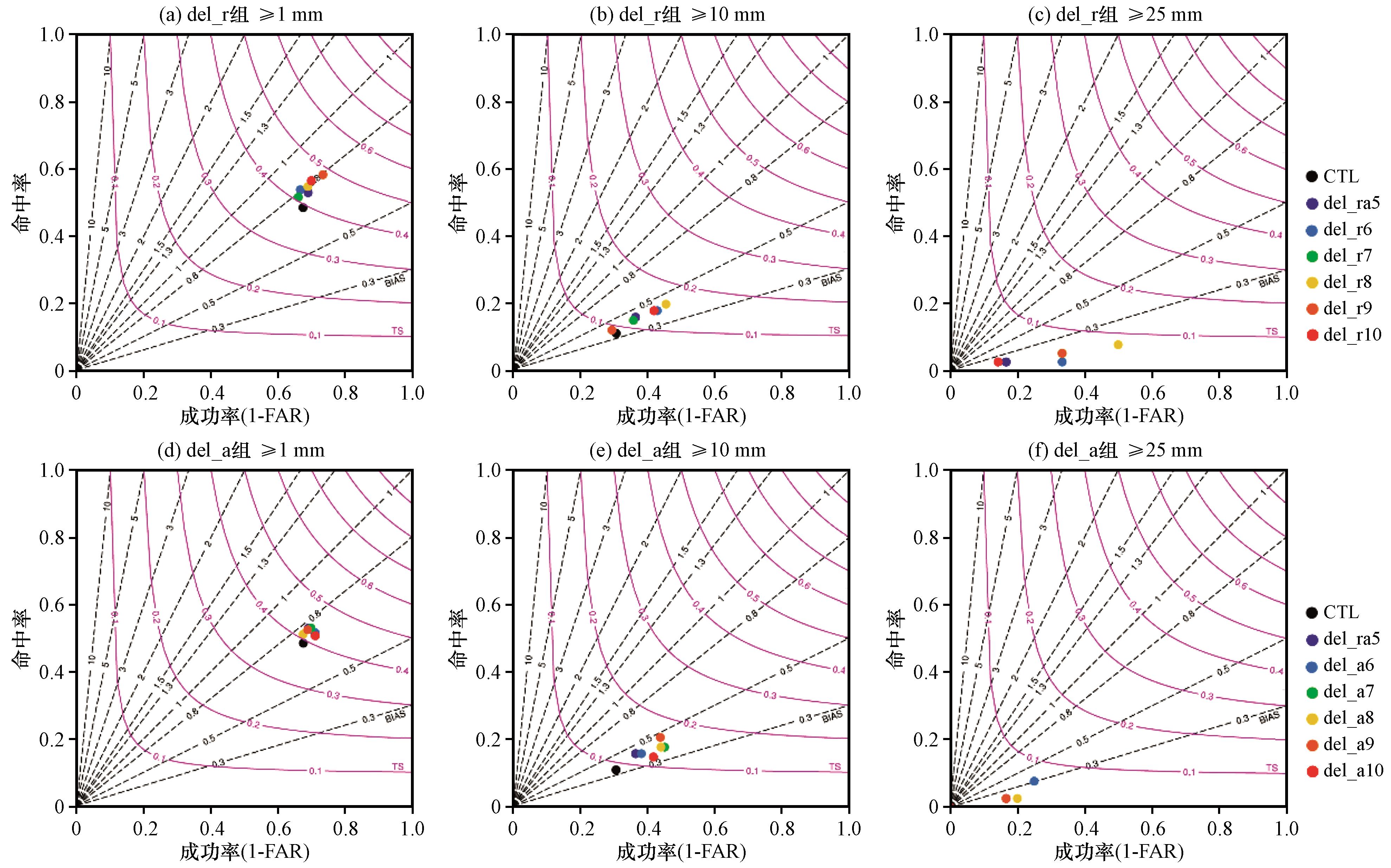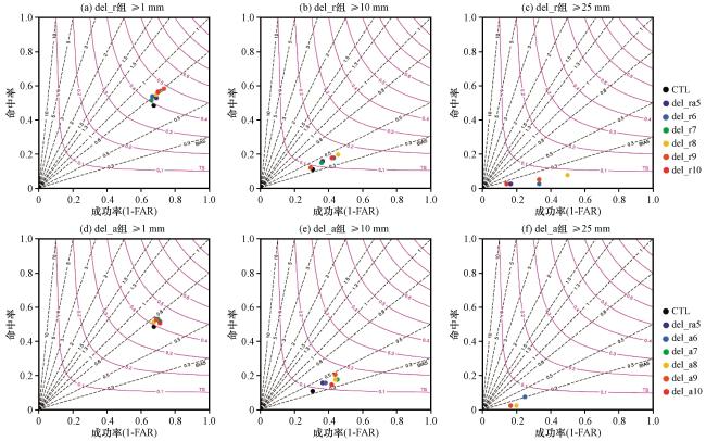 图9 2020年8月12日08:00 -14:00 del_r组(a~c)和del_a组(d~f)试验预报的累积≥1 mm (a, d)、 ≥10 mm (b, e)、 ≥25 mm(c, f)降水的评分综合图Fig.9 Performance diagram of 6-hour accumulated precipitation [≥1 mm (a, d), ≥10 mm (b, e), ≥25 mm (c, f)] by the del_r (a~c) and the del_a (d~f) group experiments from 08:00 to 14:00 on August 12, 2020 |