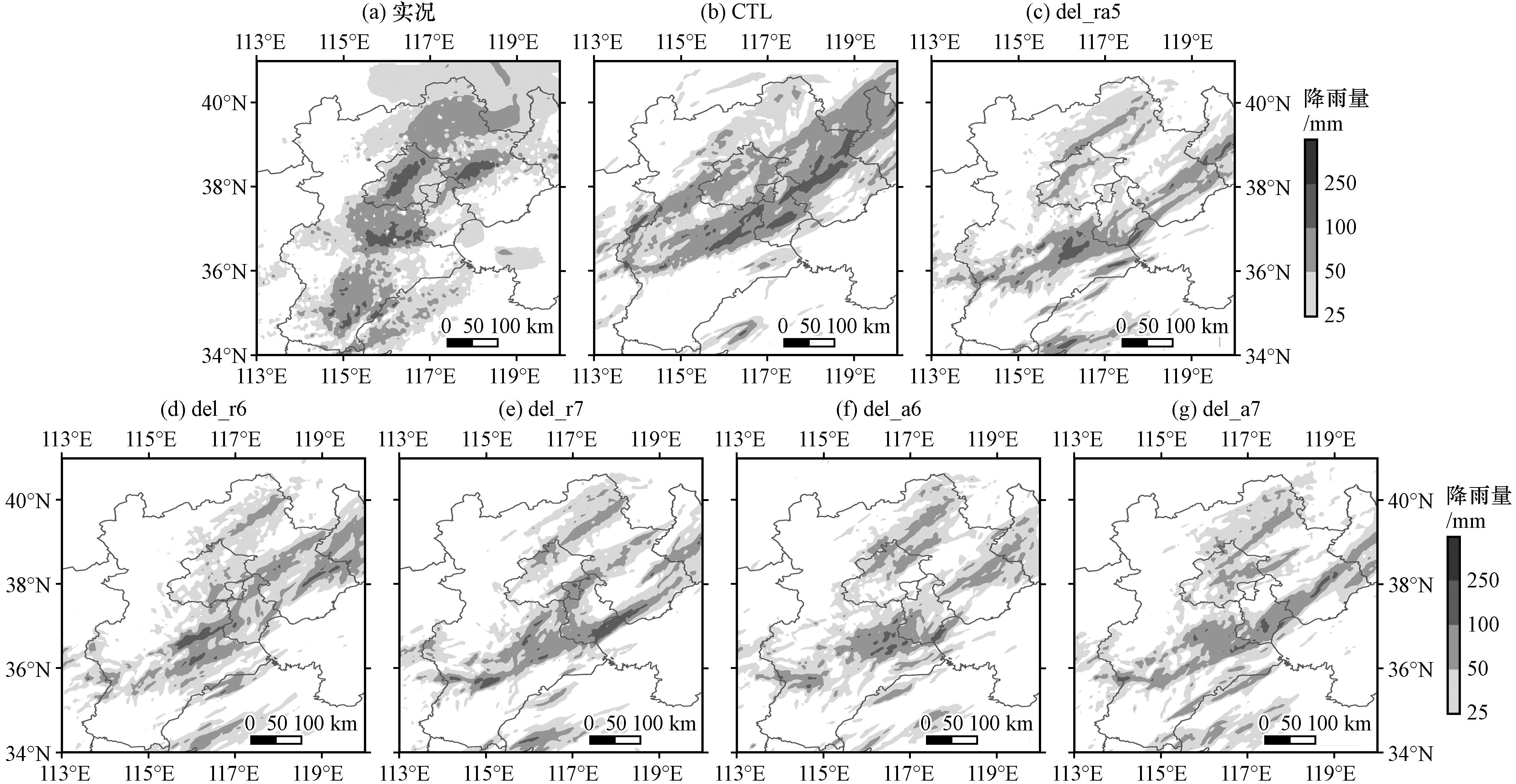 图11 2020年8月12日08:00至13日08:00 24 h累积实况和各试验模拟的降水量(单位: mm)(a)observation, (b)CTL, (c)del_ra5, (d)del_r6, (e)del_r7, (f)del_a6, (g)del_a7Fig.11 24-hour accumulated observed and simulated precipitation by each experiment from 08:00 on 12 to 08:00 on 13 August 2020.Unit: mm.(a) observation, (b) CTL, (c) del_ra5, (d) del_r6, (e) del_r7, (f) del_a6, (g) del_a7 |