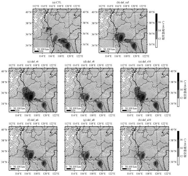 图6 2020年8月12日08:00各试验850 hPa的风场(风羽, 单位: m·s-1)、 低空急流(阴影, 单位: m·s-1)及高度场(等值线, 单位: dagpm)(a)CTL, (b)del_ra5, (c)del_r6, (d)del_r8, (e)del_r10, (f)del_a6, (g)del_a8, (h)del_a10Fig.6 The wind (barb, unit: m·s-1), low-level jet stream (shading, unit: m·s-1) and the geopotential height field (contour line, unit: dagpm) at 850 hPa from each experiment at 08:00 on August 12, 2020.(a) CTL, (b) del_ra5, (c) del_r6, (d) del_r8, (e) del_r10, (f) del_a6, (g) del_a8, (h) del_a10 |