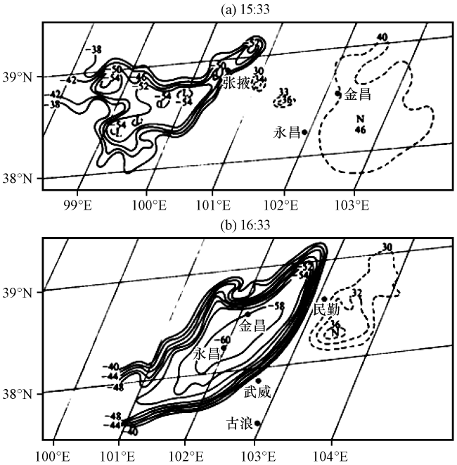 图2 1993年5月5日金昌特强飑线沙尘暴云系等亮温线分布(引自项续康等, 1996)实线为云顶等亮温线, 虚线为地面等亮温线 Fig.2 Distribution of the brightness temperature isolines of the cloud system in 19930505 squall duststorm in Jinchang, China (From Xiang et al, 1996).Solid lines are the brightness temperature isolines on the cloud top, dash lines are that on the surface |