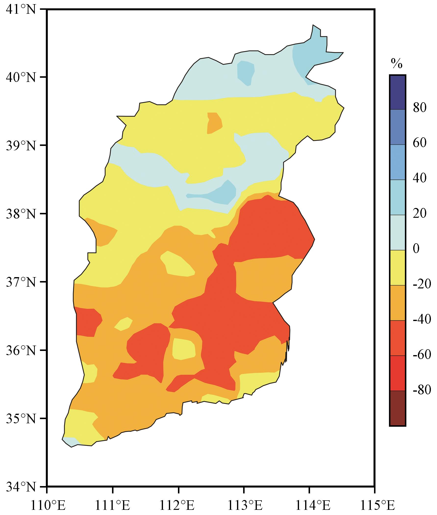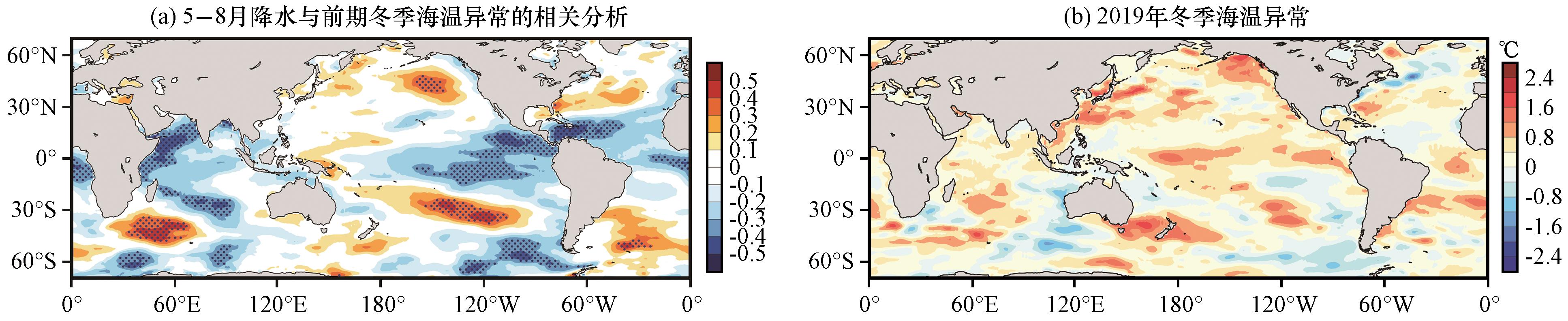图7 山西近40年5 -8月降水EOF1时间分量与前期(12月至次年2月)冬季海温异常场的相关性分析(a,打点区域为通过95%显著性检验)和2019年冬季海温异常场(b,单位:℃)Fig.7 Correlation analysis between EOF1 of precipitation from May to August in recent 40 years in Shanxi and SST anomaly field in winter (December-February) (a, dotted areas represent the significance over 95% level) and SST anomaly field in winter of 2019 (b, unit:℃) |