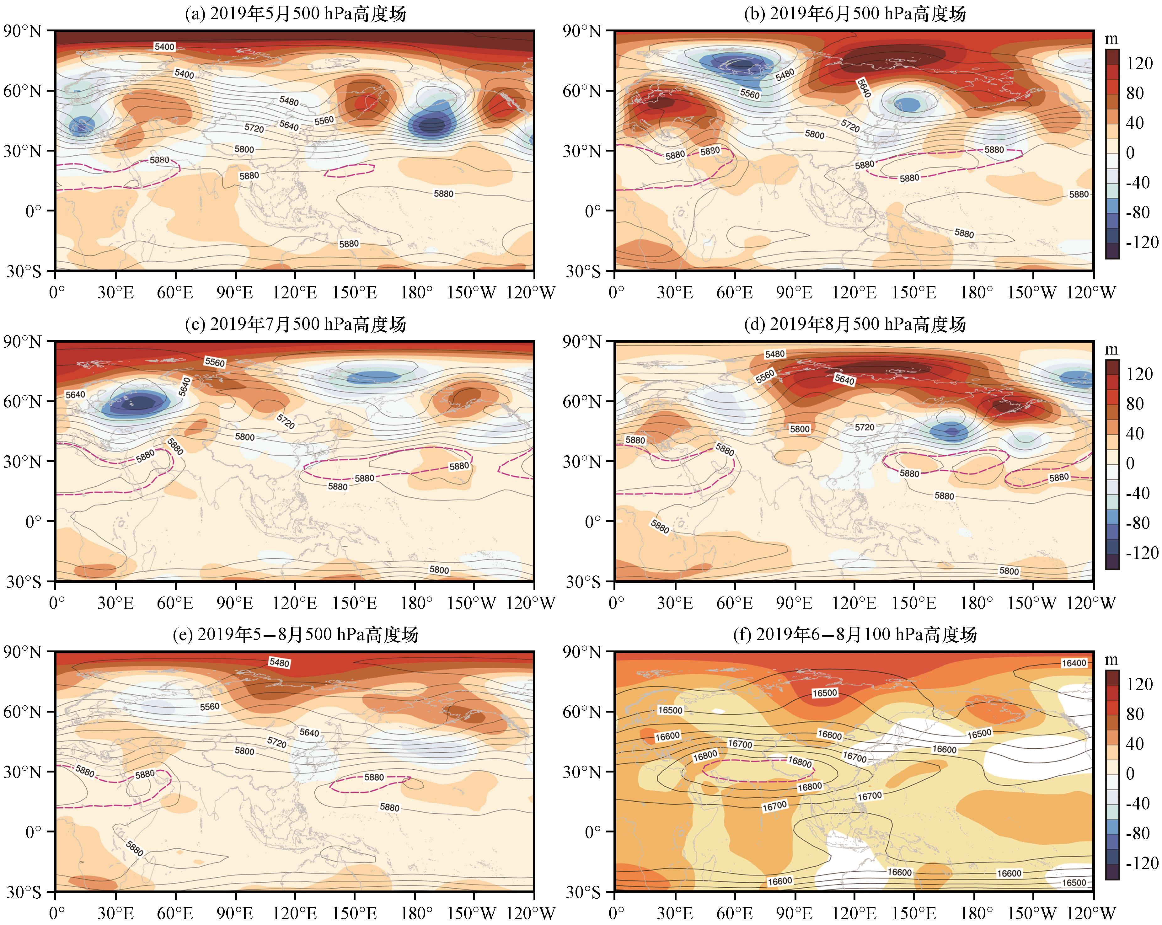 图2 2019年5 -8月500 hPa和6 -8月100 hPa环流特征(单位:m)等值线为高度场,阴影为高度异常场,紫色虚线:副高(a~e)和南亚高压(f)气候态位置 Fig.2 Circulation characteristics of 500 hPa from May to August and 100 hPa from June to August in 2019. Unit: m. Contour lines represent height fields, shaded areas represent height anomaly fields, purple dotted lines: climatological position of Western Pacific subtropical high (a~e) and South Asia high (f) |