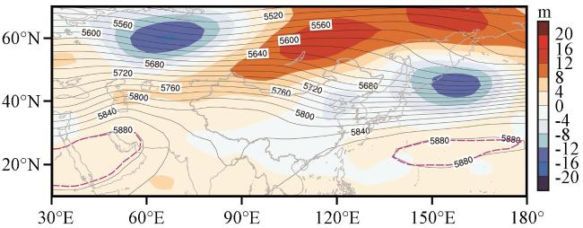 图5 历史5 -8月降水偏少年份500 hPa高度场合成(单位:m)等值线为高度场,阴影为高度异常场,紫色虚线为副高气候态位置 Fig.5 The composition of 500 hPa height field from May to August in the years of less precipitation. Unit: m. Contour lines represent height fields, shaded areas represent height anomaly fields, purple dotted lines: Climatological position of Western Pacific subtropical high |