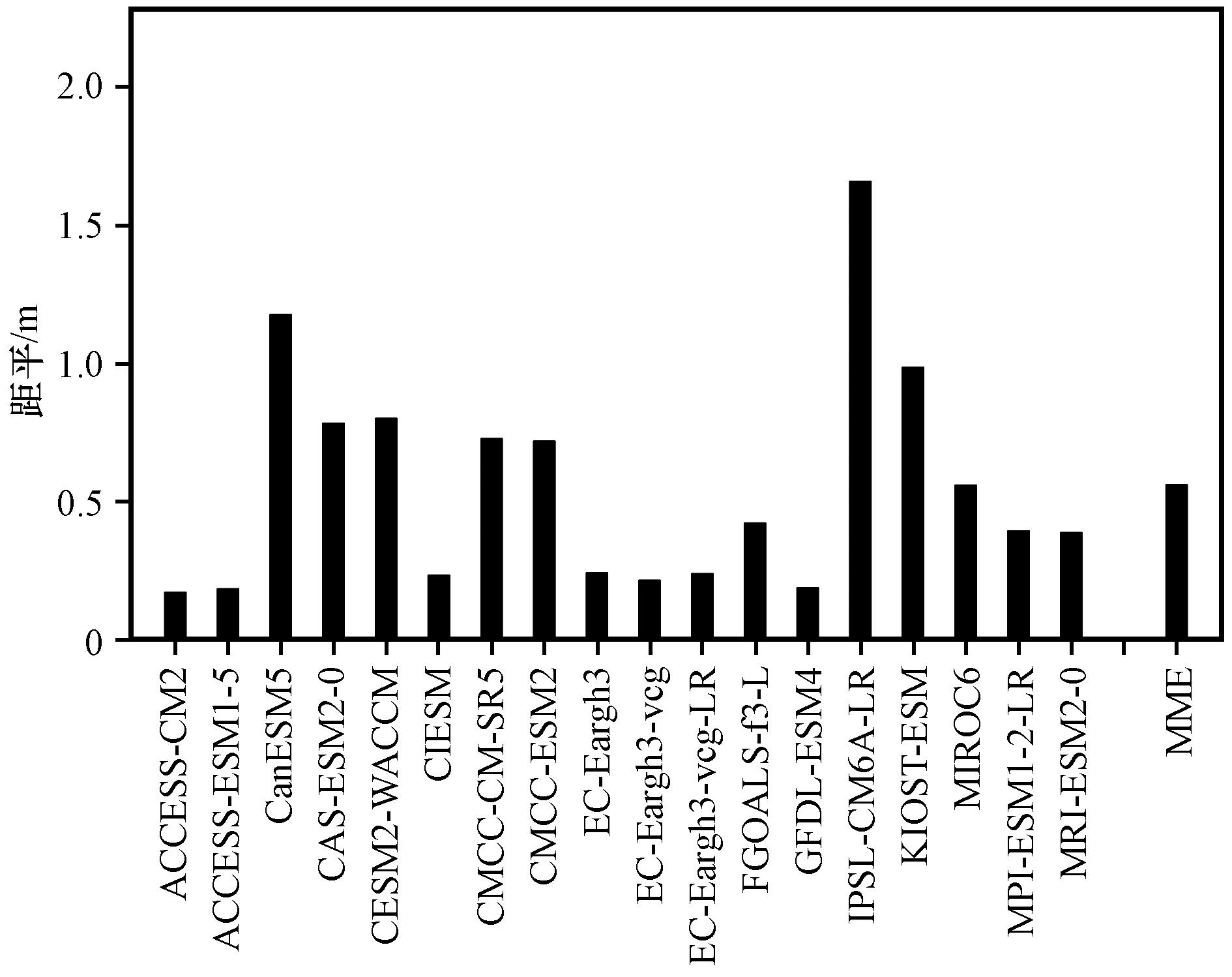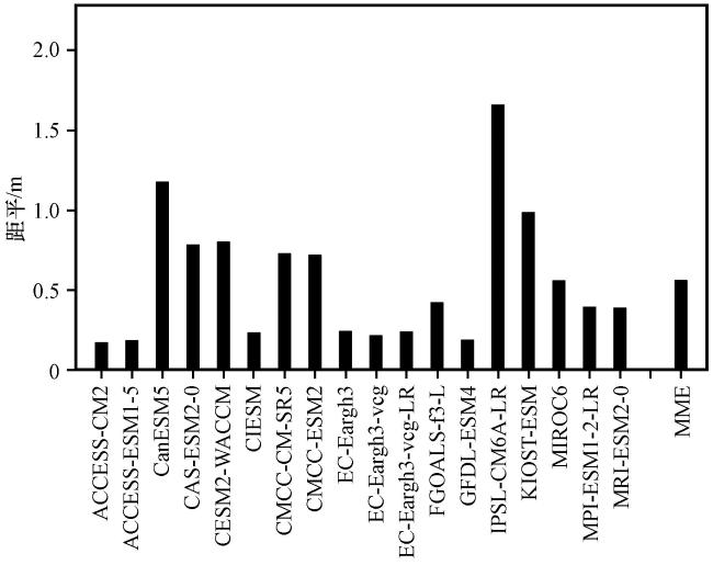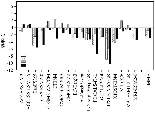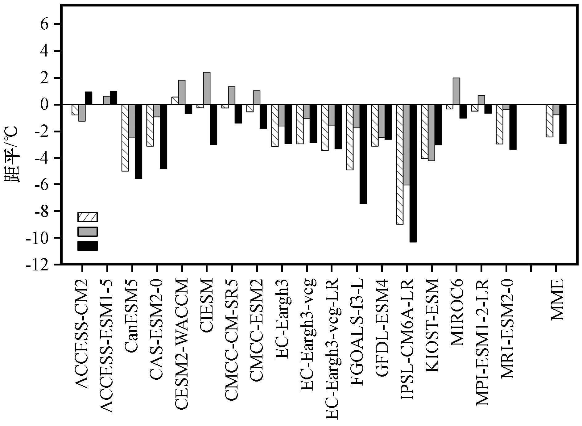 图4 1985 -2014年各模式、 多模式集合平均的年平均气温、 年均最高和最低气温与观测资料的距平Fig.4 The anomalies between the average annual average temperature, the average annual maximum and minimum temperature of each model and multi-model ensemble (MME) and the observation data from 1985 to 2014 |
