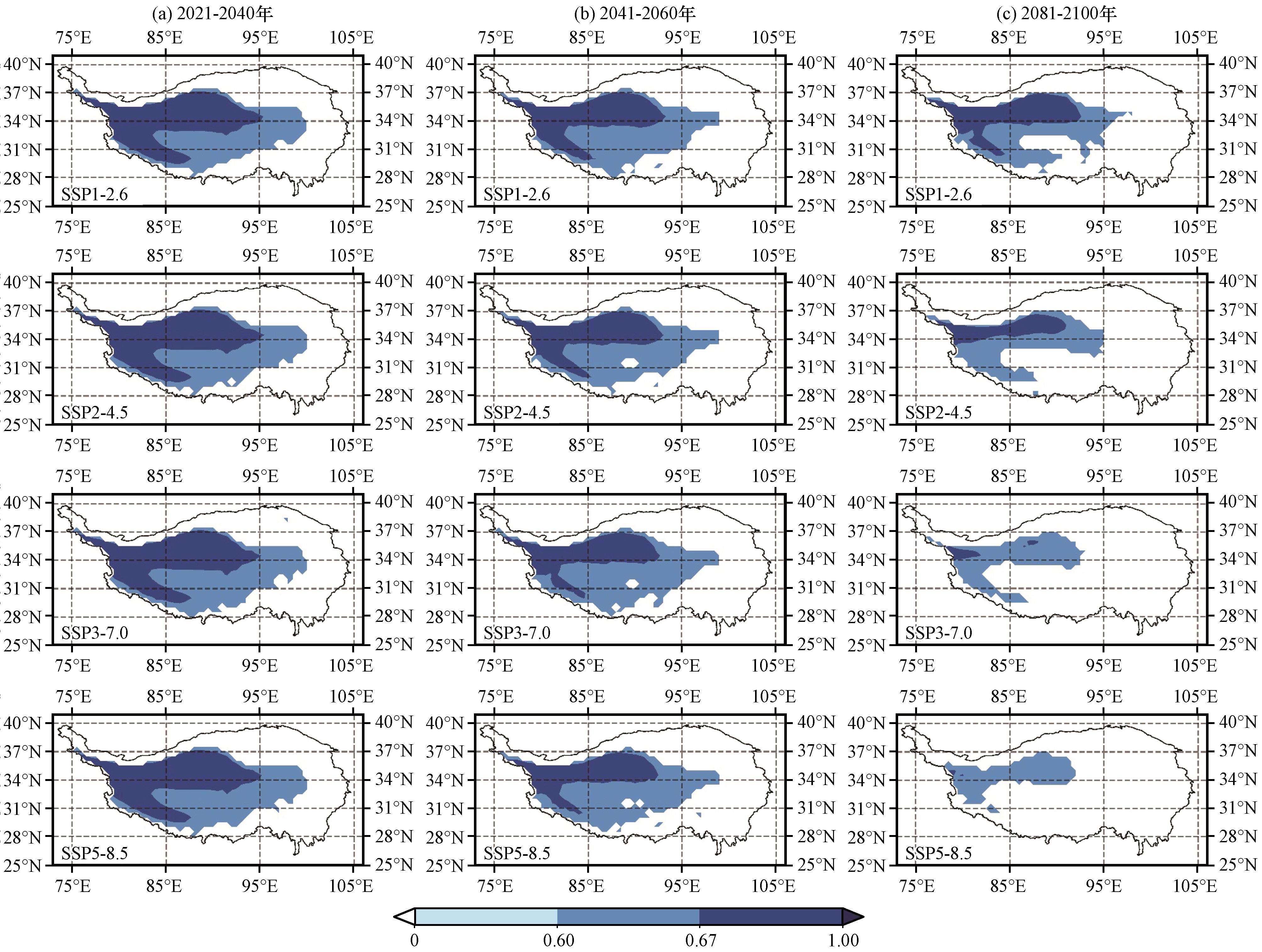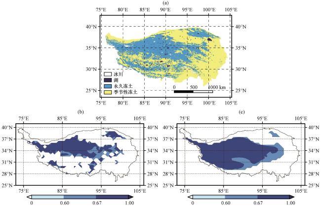 图7 青藏高原多年冻土分布现状图件(2003)(引自牛富俊和尹国安, 2018)(a)、 观测资料模拟的1985 -2014年多年冻土分布(b)和多模式集合平均模拟的1985 -2014年多年冻土分布(c)Fig.7 Map of the frozen soil in the Tibetan Plateau (2003) (From Niu and Yin, 2018)(a)、 Permafrost distribution during 1985 -2014 simulated by observation(b) and Permafrost distribution during 1985 -2014 simulated by multi-model ensemble mean on Qinghai-Xizang Plateau |