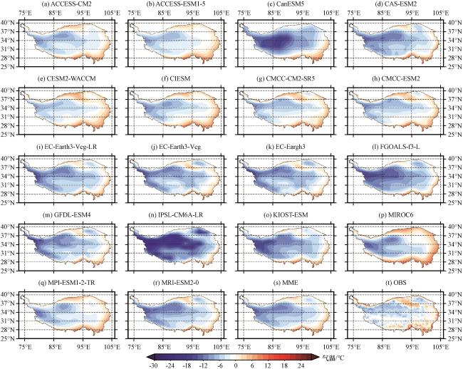 图2 各模式与观测资料在1985 -2014年年均气温空间分布Fig.2 Spatial distributions of annual mean temperature over the Qinghai-Xizang Plateau during 1985 -2014 in each model and observation |