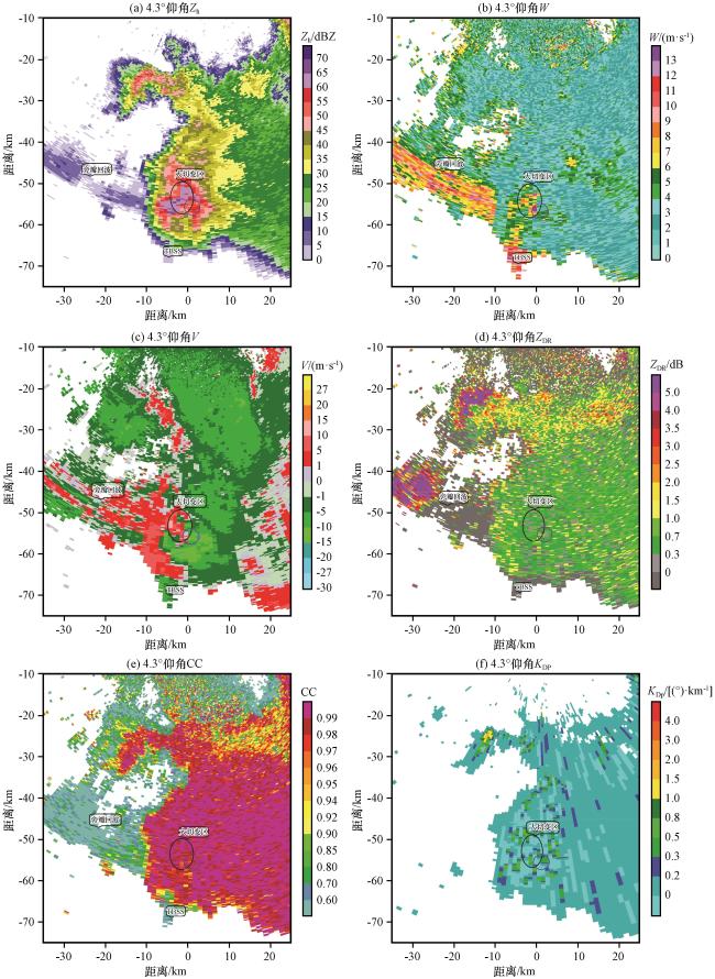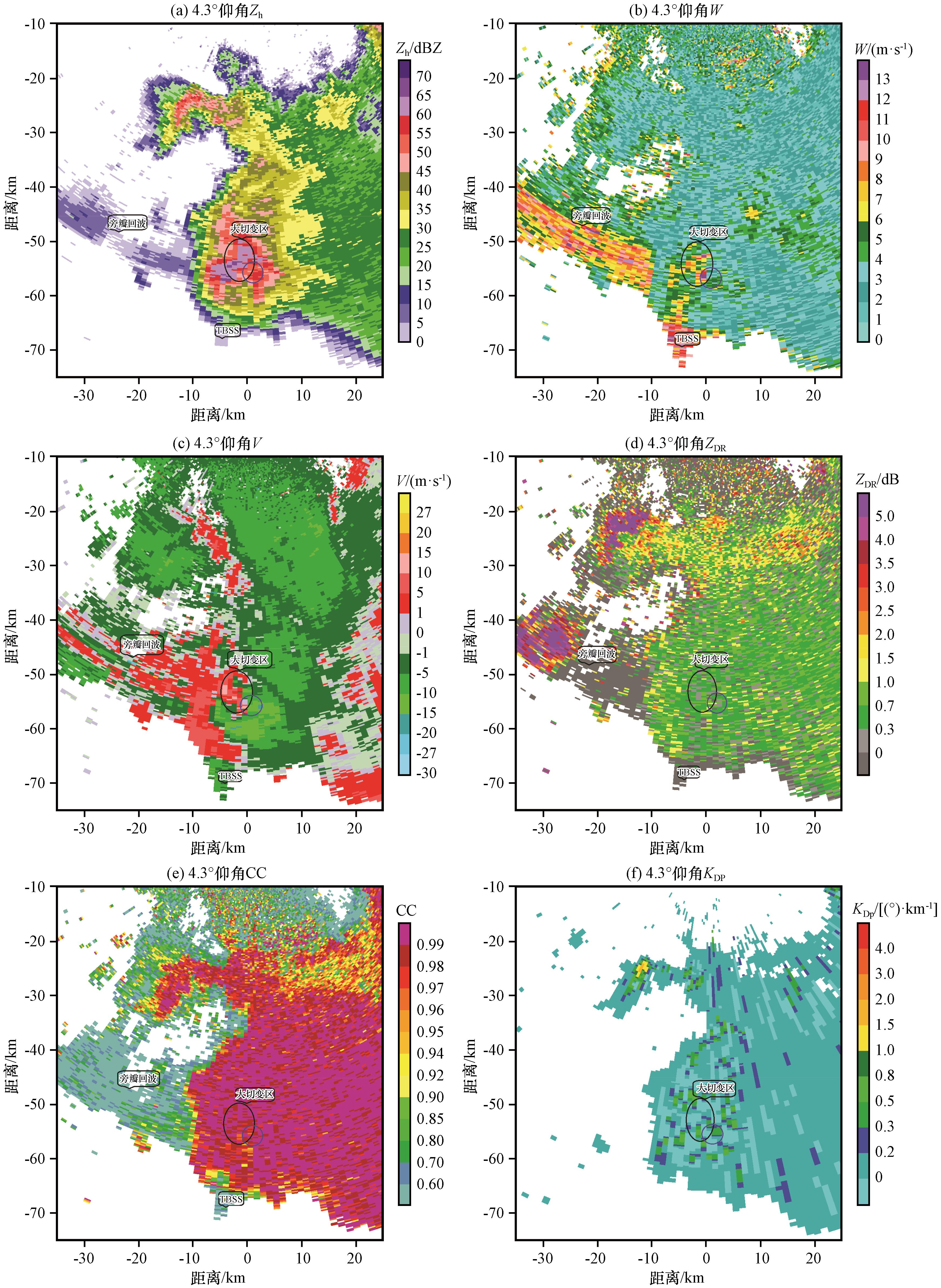 图2 2019年5月10日18:47 济南雷达4.3°仰角 Z h(a)、 W(b)、 V(c)、 Z DR(d)、 CC(e)、 K DP(f)图中坐标是指以雷达中心为坐标0点, 雷达西、 南方向用负距离表示, 东、 北方向用正距离表示 Fig.2 Z h(a), W(b), V(c), Z DR(d), CC(e)and K DP(f)at 4.3° elevation from Jinan radar at 18:47 on 10 May 2019. The coordinates in figure refer to the radar center as the coordinate point 0, the west and south directions of the radar are represented by a negative distance, and the east and north directions are represented by a positive distance |