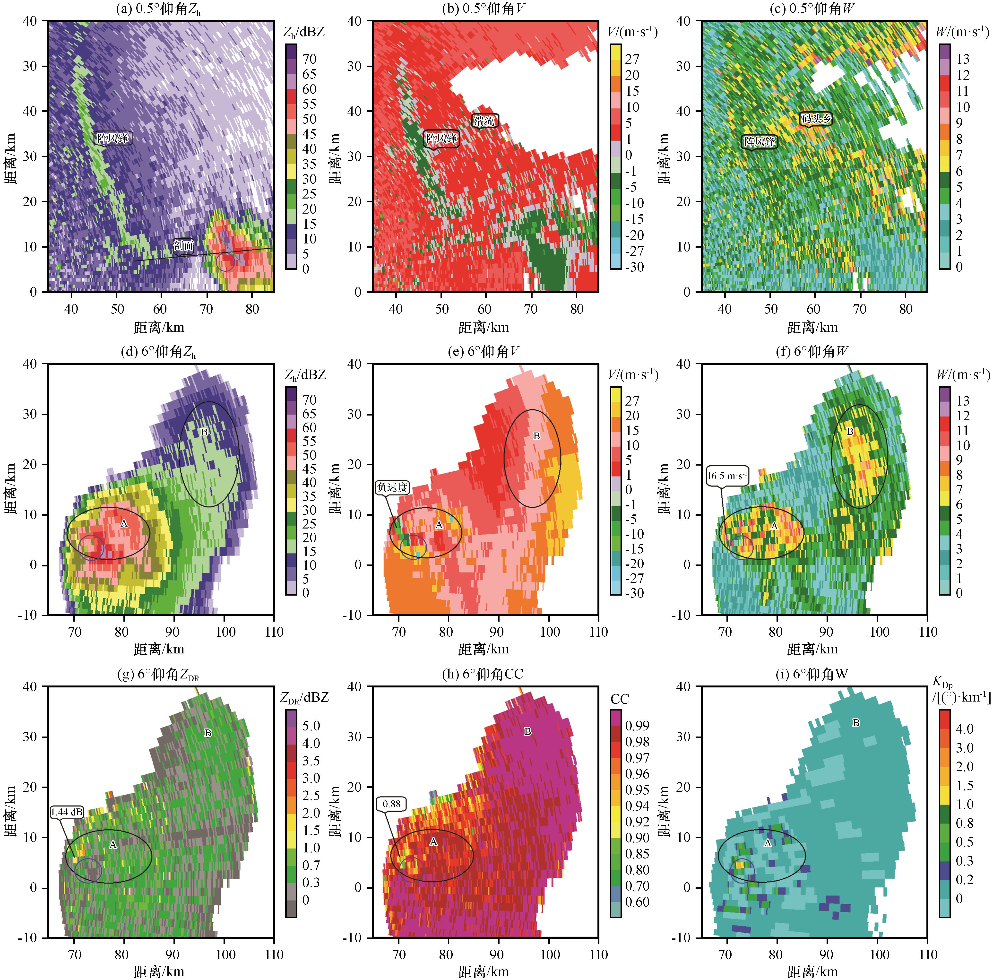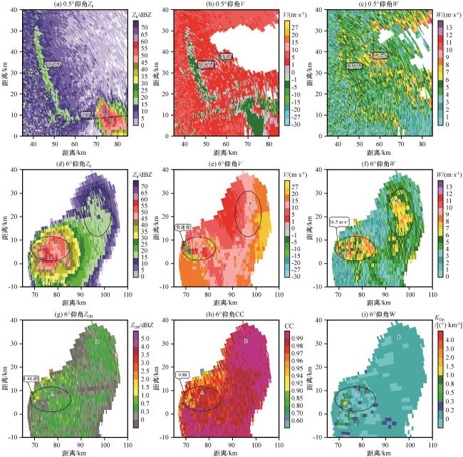 图3 2021年7月9日14:19 济南雷达0.5°仰角 Z h(a)、 V(b)、 W(c), 6°仰角 Z h(d)、 V(e)、 W(f)、 Z DR(g)、 CC(h)、 K DP(i)图(a)、 (b)、 (c)中的坐标是指以雷达中心为坐标0 点, 雷达西、 南方向用负距离表示, 东、 北方向用正距离表示 Fig.3 Z h (a), V (b)and W (c)at 0.5° elevation and Z h (d), V (e), W (f), Z DR (g), CC (h), and K DP (i) at 6° elevation from Jinan radar at 14:19 on 10 July 2021. The coordinates in figure (a), (b) and (c) refer to the radar center as the coordinate point 0, the west and south directions of the radar are represented by a negative distance, and the east and north directions are represented by a positive distance |