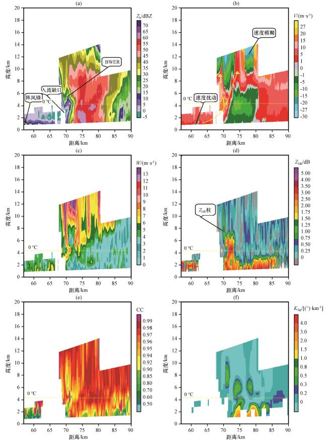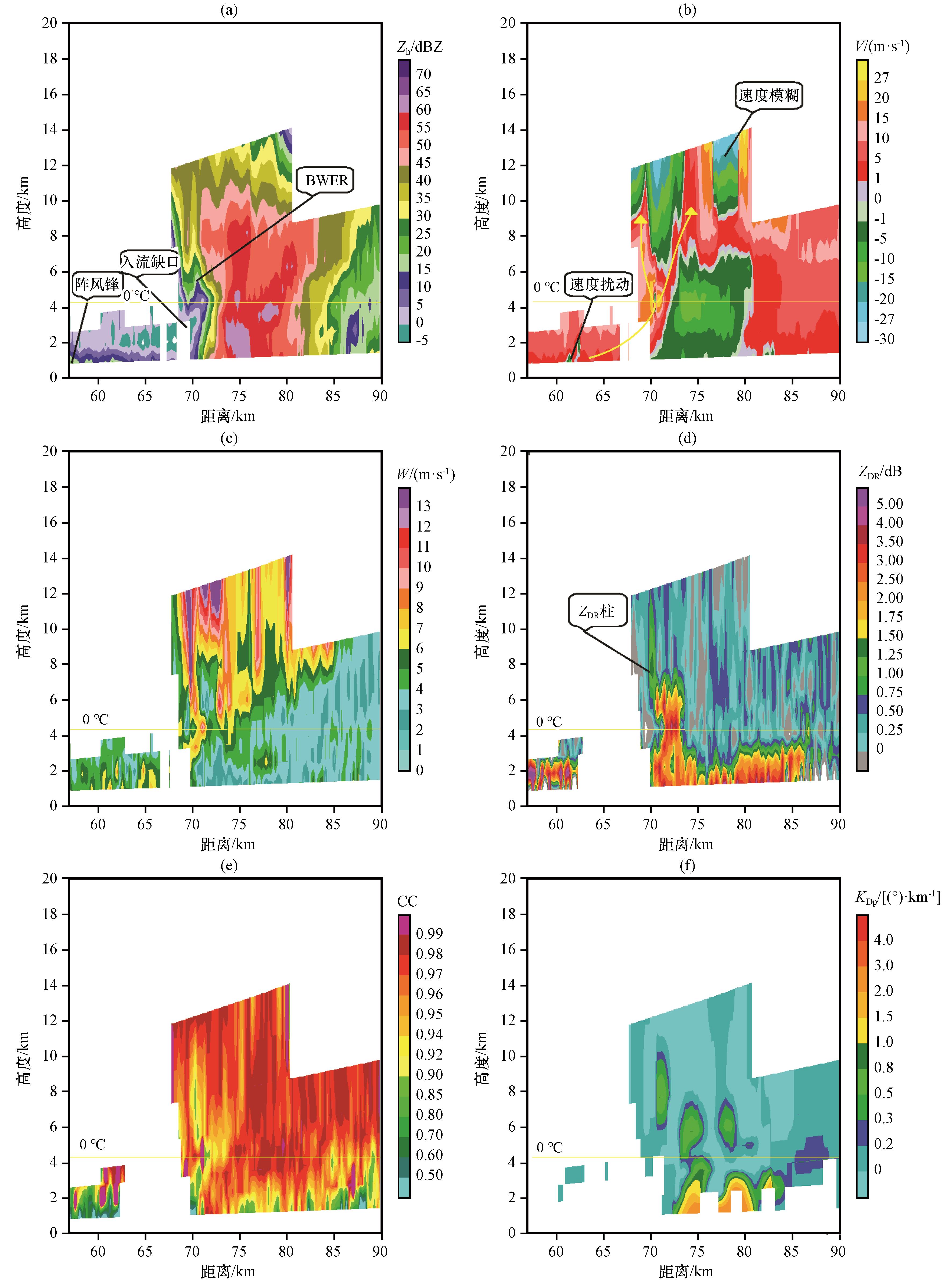 图4 沿图3(a)中黑色实线所做的 2021年7月9日14:19济南雷达回波垂直剖面, Z h(a)、 V(b)、 W(c)、 Z DR(d)、 CC(e)、 K DP(f)黄色实线为0 ℃等温线 Fig.4 Vertical profile of Z h (a), V (b), W (c), Z DR (d), CC (e) and K DP (f) along solid black line in Fig.3(a) from Jinan radar at 14:19 on 9 July 2021. The yellow dash line is the 0 ℃ isotherm |