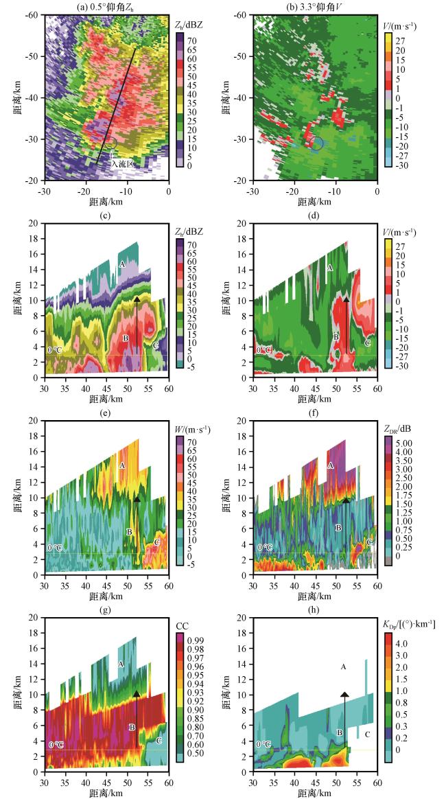 图1 2019年5月10日18:18济南雷达0.5°仰角反射率因子 Z h(a), 3.3°仰角多普勒速度 V(b), 沿图(a)中黑色实线所做的垂直剖面, 水平反射率因子 Z h(c), 多普勒速度 V(d), 谱宽 W(e), 差分反射率因子 Z DR(f), 相关系数CC(g)及差分相移率 K DP(h)图(a)、 (b)中的坐标是指以雷达中心为坐标0点, 雷达西、 南方向用负距离表示, 东、 北方向用正距离表示, 黄色实线为0℃等温线 Fig.1 Reflectivity factor Z h (a) at 0.5° elevation, velocity V (b) at 3.3° elevation, and vertical profile of horizontal reflectivity factor (c), Doppler velocity (d), spectral width W (e), differential reflectivity factor (f), correlation coefficient (g), differential phase constant K DP (h) along solid black line in Fig.1(a) from Jinan radar at 18:18 on 10 May 2019. The coordinates in figure (a) and (b) refer to the radar center as the coordinate point 0, the west and south directions of the radar are represented by a negative distance, and the east and north directions are represented by a positive distance.The yellow line is the 0 ℃ isotherm |