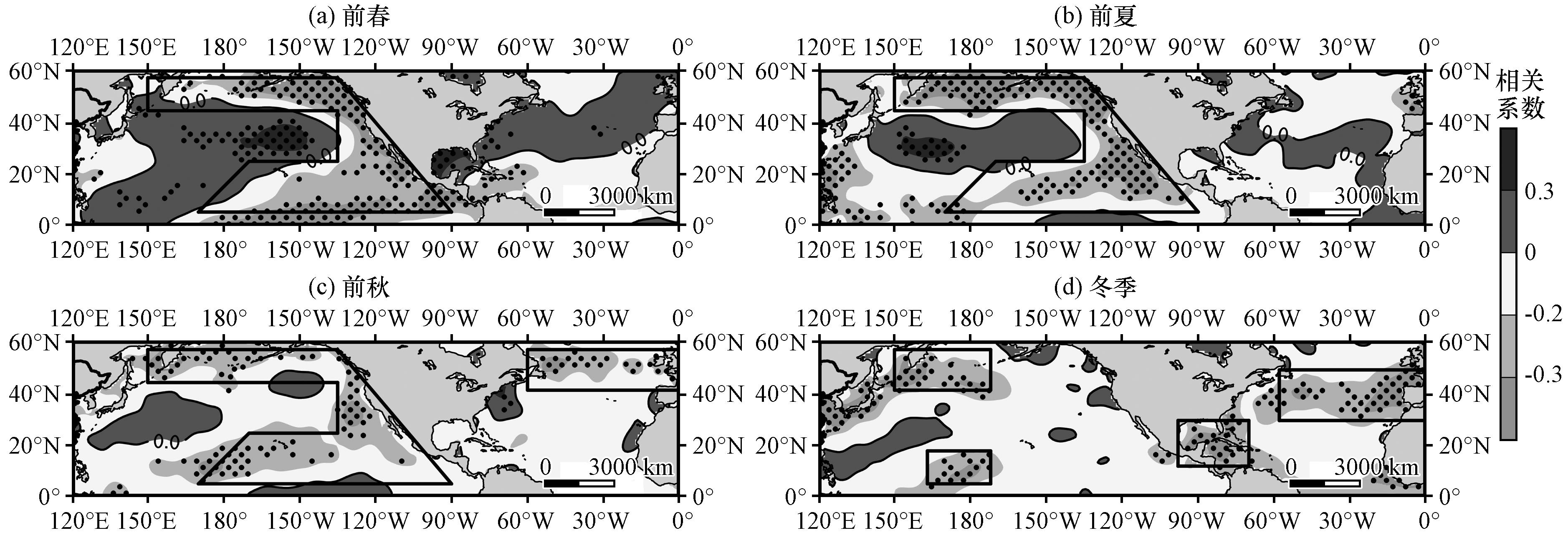 图4 北方冬季单站寒潮强度PC1与前春(a)、 前夏(b)、 前秋(c)、 冬季(d)的中纬度海温异常的时滞相关系数分布打点区域通过90%置信水平; 黑框区域为海温关键区 Fig.4 The lead-lag and contemporaneous correlation coefficients between PC1 of single-station cold wave intensity during the winter in northern China and the mid-latitude SSTA in pre-spring (a), pre-summer (b), pre-autumn (c), winter (d).The dotted areas are significant at the 90% confidence level; the black box areas are the SST key areas |