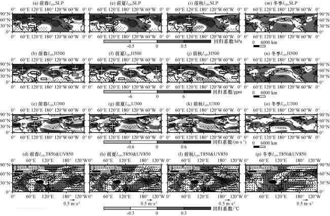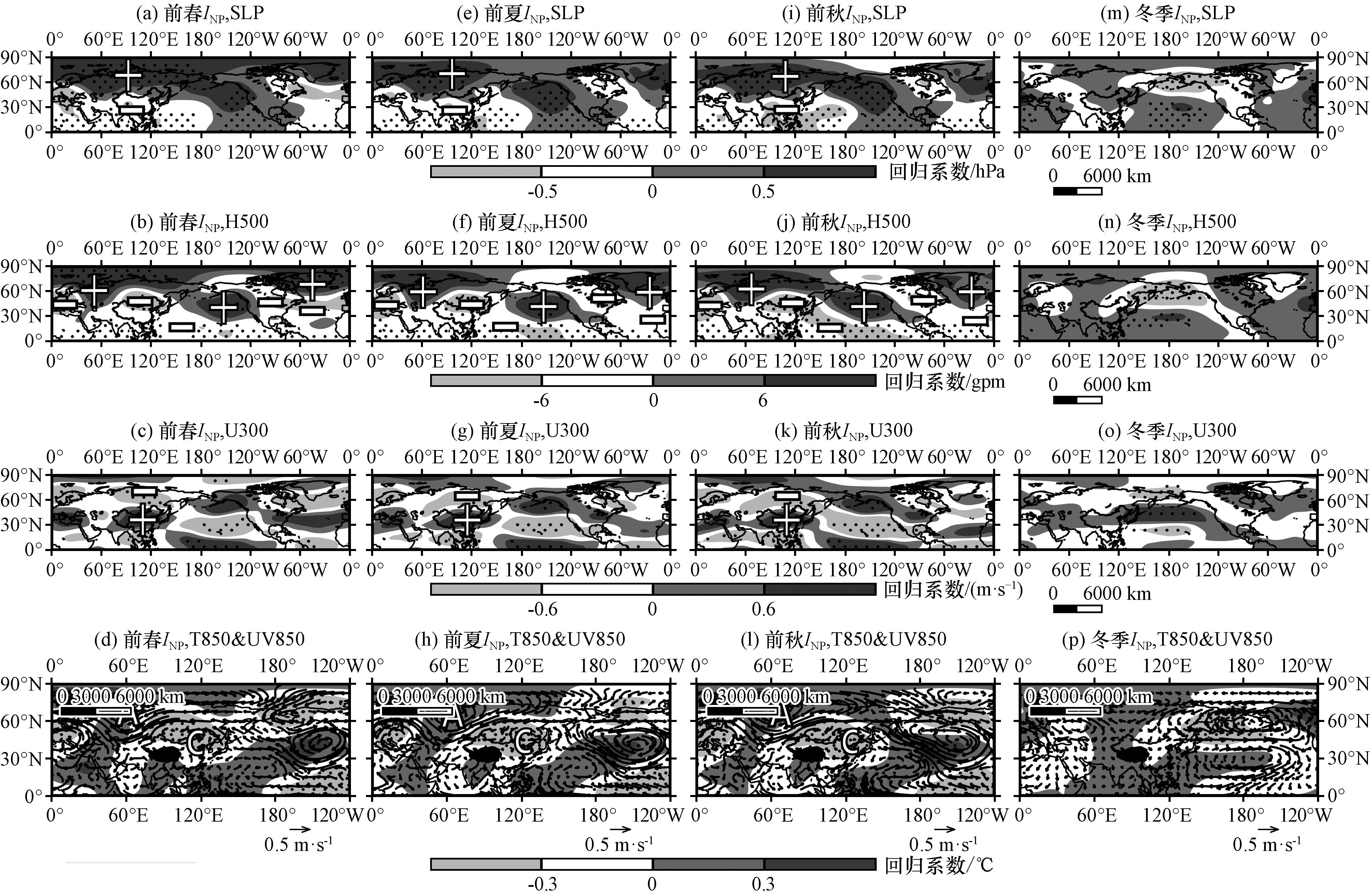 图5 冬季SLP场(单位: hPa)、 H500(单位: gpm)、 U300(单位: m·s-1)、 T850(单位: ℃)和 UV850(单位: m·s-1)分别与前春、 前夏、 前秋、 冬季I NP的线性回归系数(数值乘-1)打点区域通过90%置信水平; “+” 、 “-”号分别代表各个要素场的正负异常中心; “A” 、 “C”分别代表反气旋和气旋性环流异常中心 Fig.5 Linear regression coefficients of SLP (unit: hPa)、 H500 (unit: gpm)、 U300 (unit: m·s-1)、 T850 (unit: °C)、 and UV850 (unit: m·s-1) in winter onto the I NP in pre-spring, pre-summer, pre-autumn and winter, respectively.All values are multiplied by -1.The dotted areas are significant at the 90% confidence level; “+” and “-” indicate the centers of positive and negative anomalies on each element field, respectively; the letters “A” and “C” indicate the centers of anticyclonic and cyclonic anomalies, respectively |