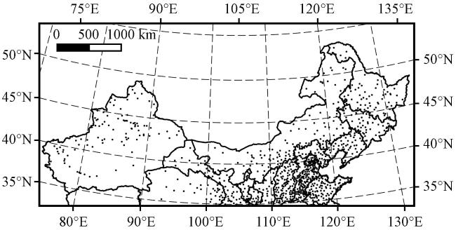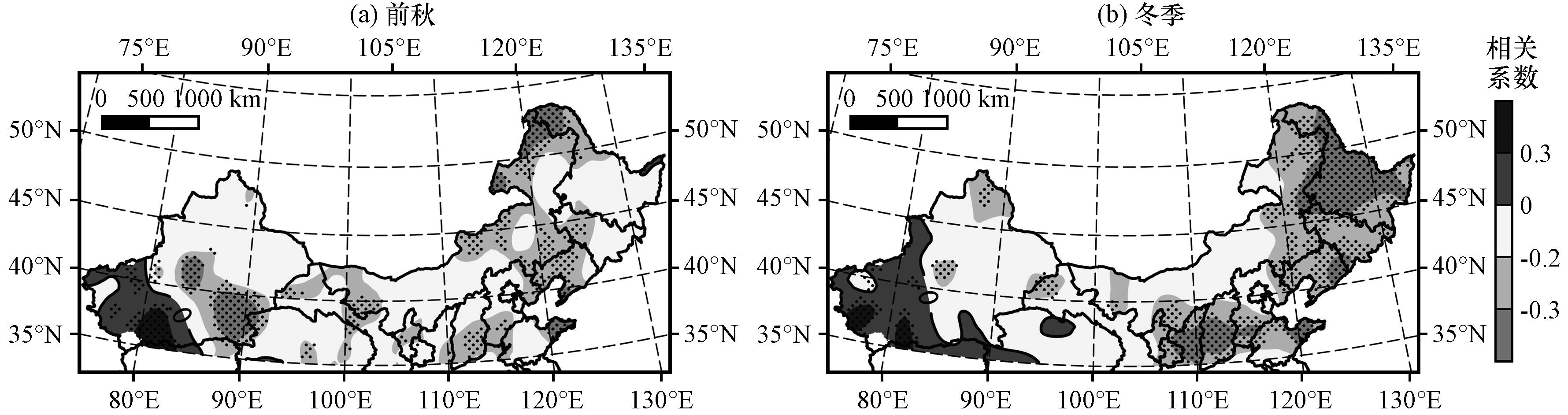 图7 北方冬季单站寒潮强度分别与前秋(a)、 冬季(b)I NP+I ATL相关系数分布打点区域通过90%置信水平 Fig.7 The correlation coefficients between the single-station cold wave intensity during the winter in northern China and I NP+I ATL in pre-autumn (a), winter (b), respectively.The dotted areas are significant at the 90% confidence level |