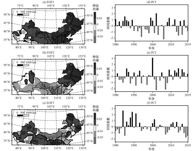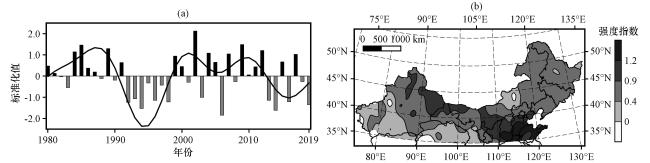 图2 1980 -2019年冬季我国北方区域平均寒潮过程强度指数标准化时间序列(a)和单站寒潮偏强年平均强度指数空间分布(b)Fig.2 The normalized series of regional averaged intensity index of single-station cold wave processes (a) and the spatial distribution of single-station cold wave intensity averaged in the stronger years in northern China (b) in winter from 1980 to 2019 |