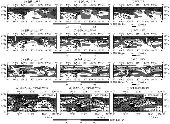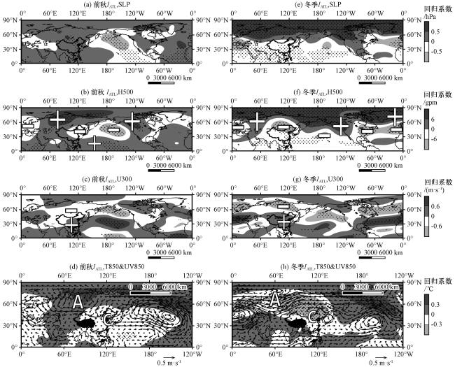 图6 冬季SLP场(单位: hPa)、 H500(单位: gpm)、 U300(单位: m·s-1)、 T850(单位: ℃)和 UV850(单位: m·s-1)分别与前秋、 冬季I ATL的线性回归系数(数值乘-1)打点区域通过90%置信水平; “+” 、 “-”号分别代表各个要素场的正负异常中心; “A” 、 “C”分别代表反气旋和气旋性环流异常中心 Fig.6 Linear regression coefficients of SLP (unit: hPa)、 H500 (unit: gpm)、 U300 (unit: m·s-1)、 T850 (unit: °C)、 and UV850 (unit: m·s-1) in winter onto the I ATL in pre-autumn and winter, respectively.All values are multiplied by -1.The dotted areas are significant at the 90% confidence level; “+” and “-” indicate the centers of positive and negative anomalies on each element field, respectively; the letters “A” and “C” indicate the centers of anticyclonic and cyclonic anomalies, respectively |