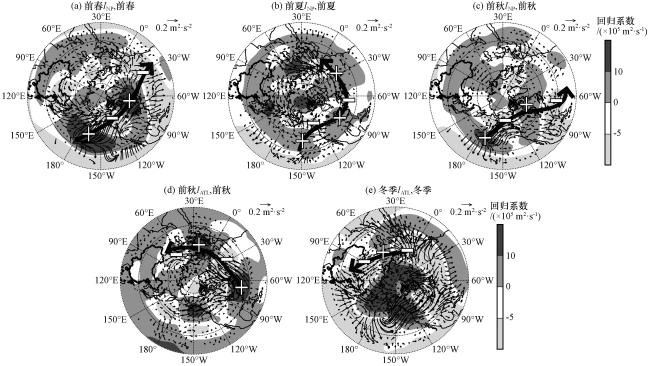 图9 前春(a)、 前夏(b)、 前秋(c)I NP和前秋(d)、 冬季(e)I ATL分别与对应季节300 hPa T-N波通量(单位: m2·s-2)、 流函数(单位: ×105 m2·s-1)异常场的线性回归系数(数值乘-1)“+” 、 “-”号分别代表流函数的正负异常中心; 粗黑色矢量箭头代表波通量传播方向 Fig.9 Linear regression coefficients of 300 hPa T-N wave flux (unit: m2·s-2) and flow function (unit: ×105 m2·s-1) anomalies field in the corresponding season onto the INP in pre-spring (a), presummer (b), pre-autumn (c) and IATL in pre-autumn (d), winter (e). All values are multiplied by -1. “+” and “-” indicate the centers of positive and negative anomalies on flow function field, respectively; thick black vector arrows indicate the direction of wave flux propagation |