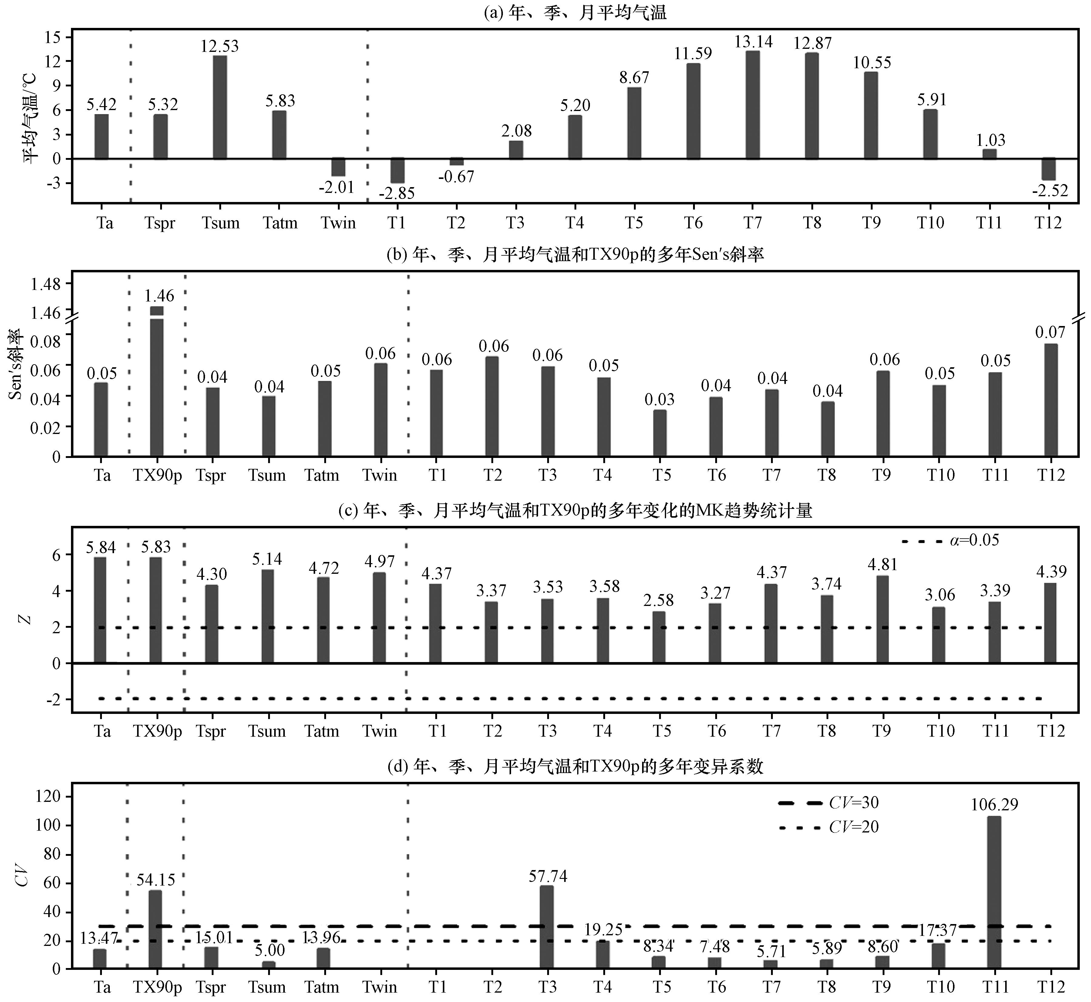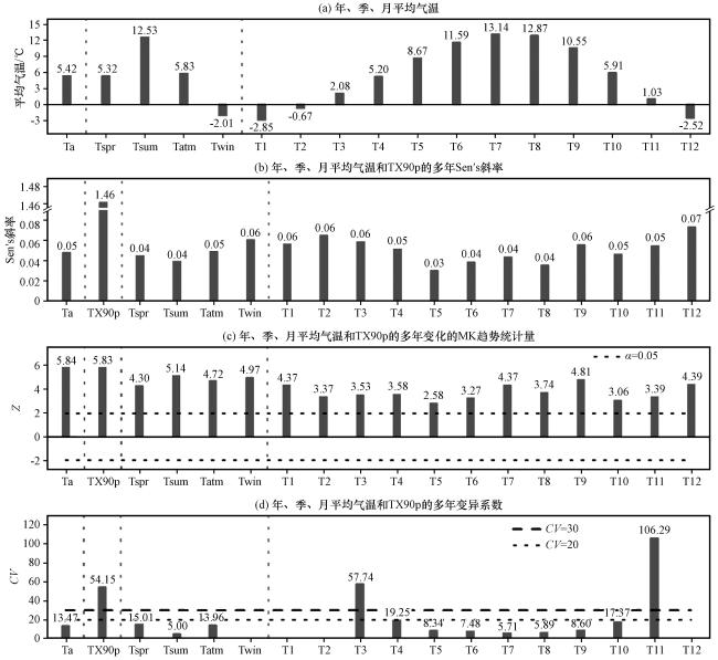 图3 西藏波密卡达沟流域年、 季、 月平均气温和TX90p变化的基本统计量 Ta代表年均气温; Tspr-win分别代表春夏秋冬四季平均气温; T1-12依次代表1 -12月的平均气温; 图中垂直虚线表示年、 季、 月平均气温和TX90p变量之间的分隔线Fig.3 Basic statistics of annual, seasonal and monthly mean air temperature and TX90p in Kada valley, Bomi County, Tibet (Ta represents annual mean air temperature; Tspr-win represents the mean air temperature of four seasons; T1-12 represents the mean air temperature from January to December; The vertical dashed lines in the graph demarcate the boundaries between the variables of annual, seasonal, monthly mean air temperature, and TX90p) |