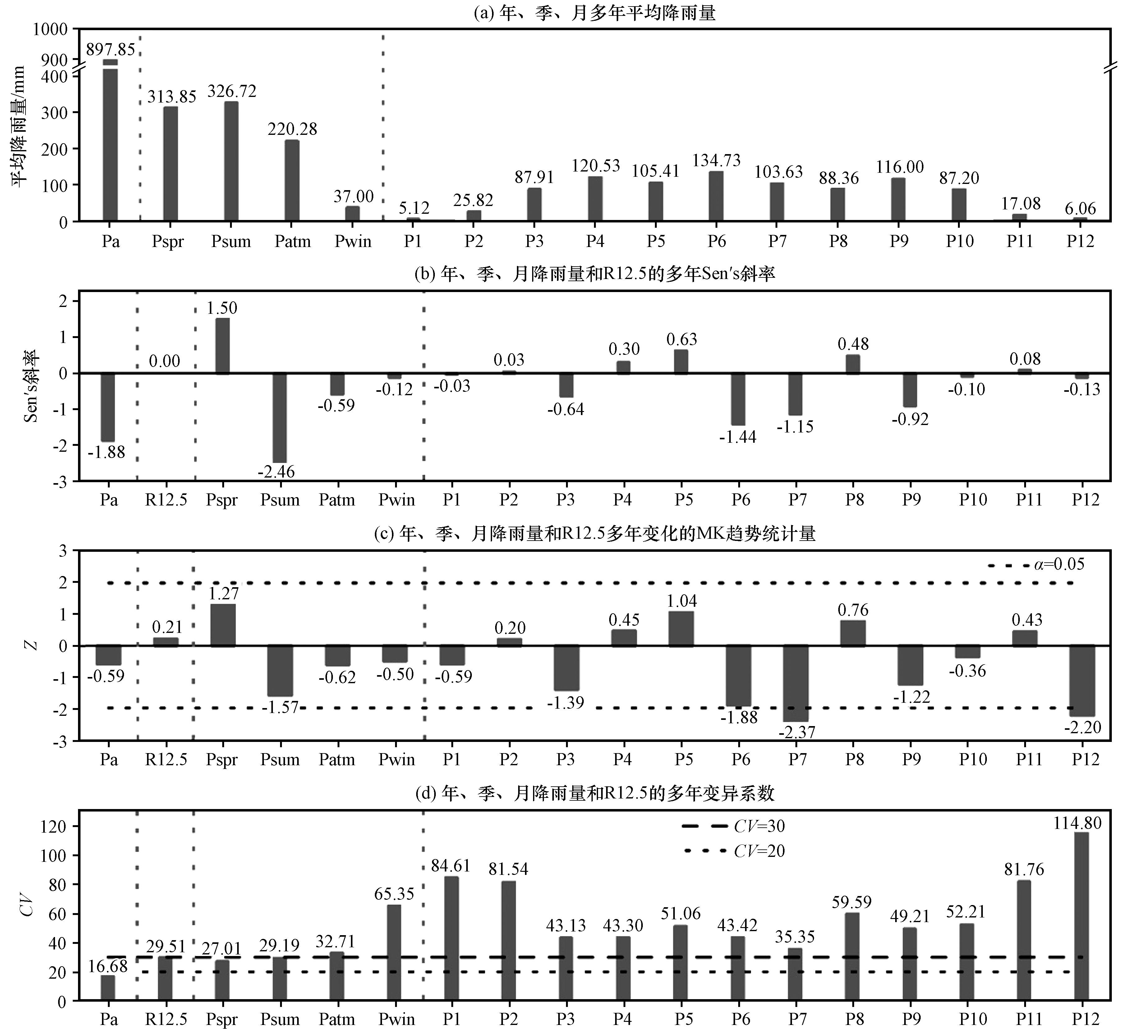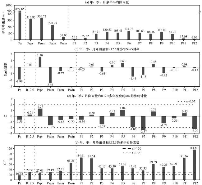 图7 西藏波密卡达沟流域年、 季、 月降雨量和R12.5变化的基本统计量 Pa代表年降雨量; Pspr-win分别代表春夏秋冬四季降雨量; P1-12依次代表1到12月份的降雨量; 图中垂直虚线表示年、 季、 月降雨量和R12.5变量之间的分隔线Fig.7 Basic statistics of annual, seasonal, monthly rainfall and R12.5 in Kada valley, Bomi County, Tibet (Pa represents annual rainfall; Pspr-win represents the rainfall of four seasons; P1-12 represents rainfall from January to December; The vertical dashed lines in the graph demarcate the boundaries between the variables of annual, seasonal, monthly rainfall, and R12.5) |