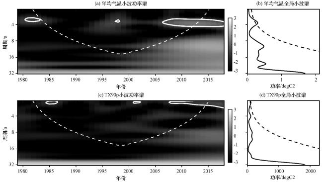 图5 西藏波密卡达沟流域年均气温和TX90p的小波功率谱和全局小波谱 图中色条表示小波功率谱强度, 颜色越浅, 能量越强Fig.5 Wavelet power spectrum and global wavelet spectrum of annual mean air temperature and TX90p in Kada valley, Bomi County, Tibet.The color bars represent the intensity of the wavelet power spectrum, where lighter colors indicate higher energy |